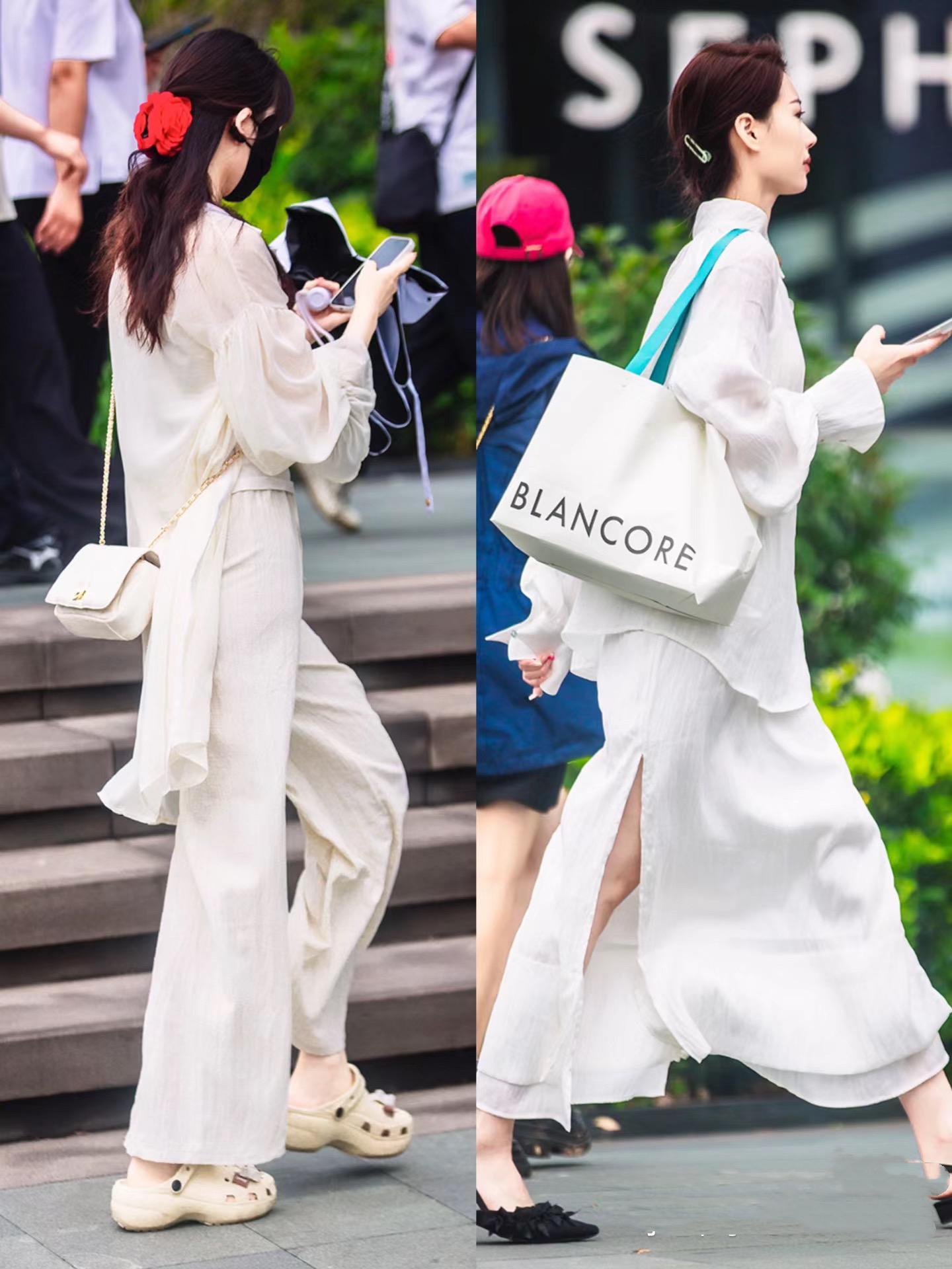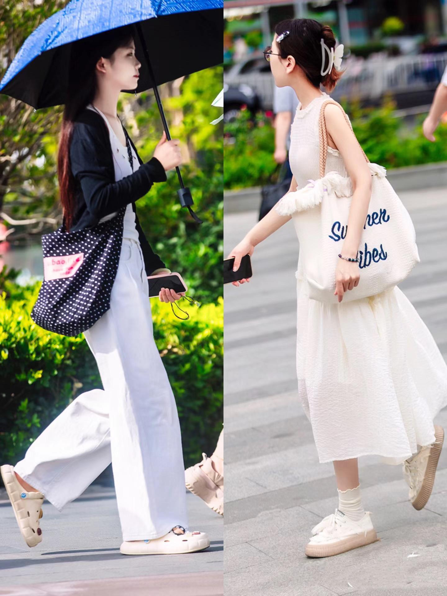 白色直筒褲,上身即可得到清涼氛圍,尤其是與白色吊帶、洞洞鞋的搭配,簡潔明瞭、甚至清涼。