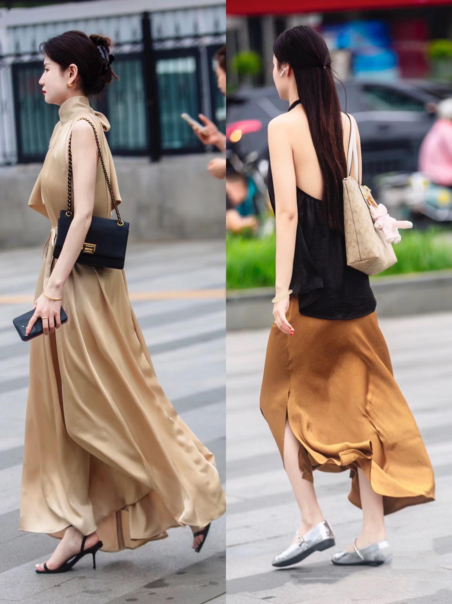 露背的掛脖背心,配上過膝的醋酸半身裙,是精緻優雅的、也是鬆弛大方的。