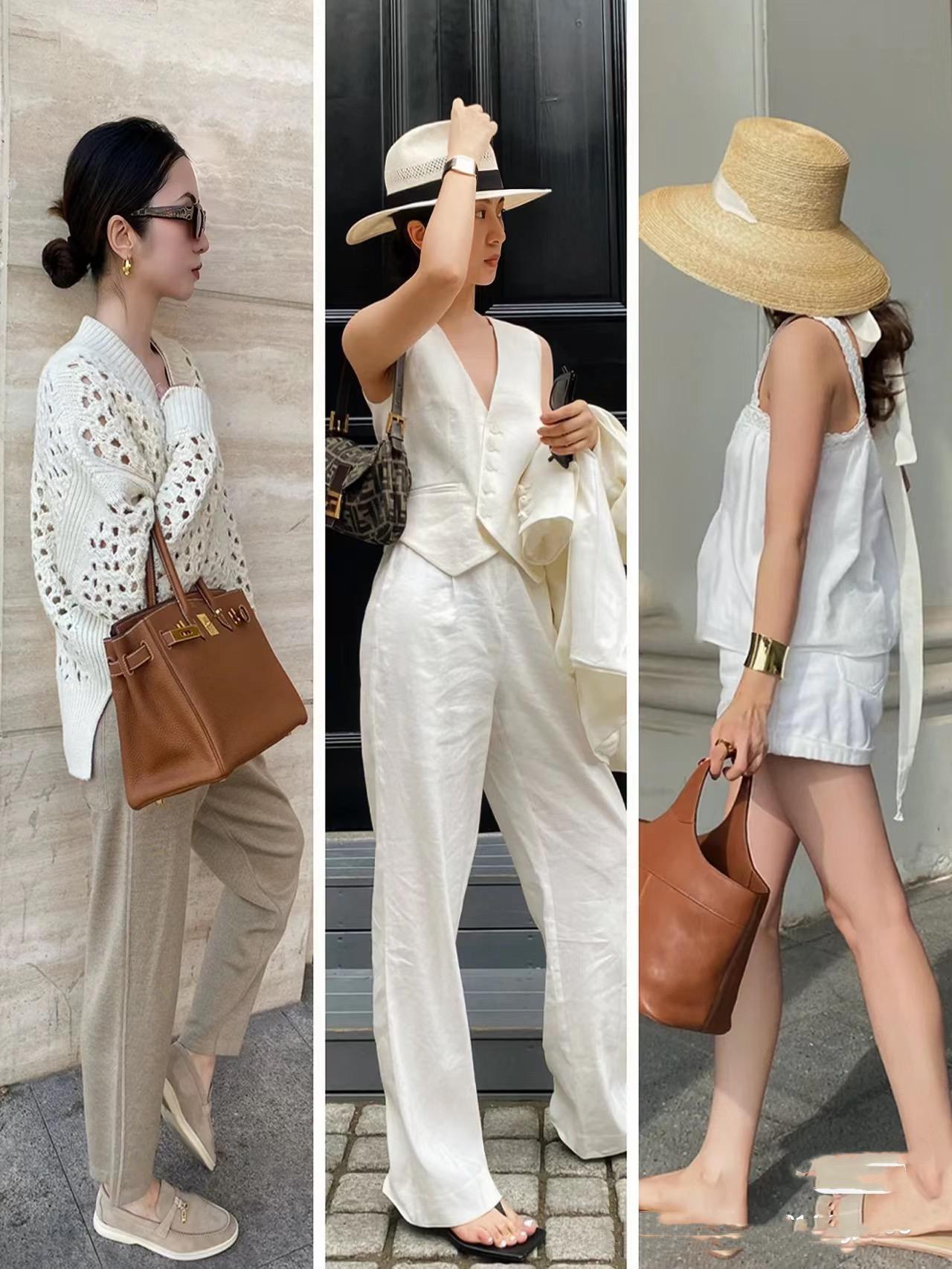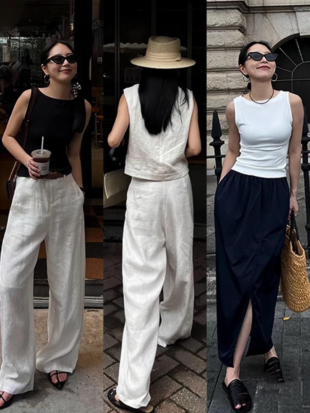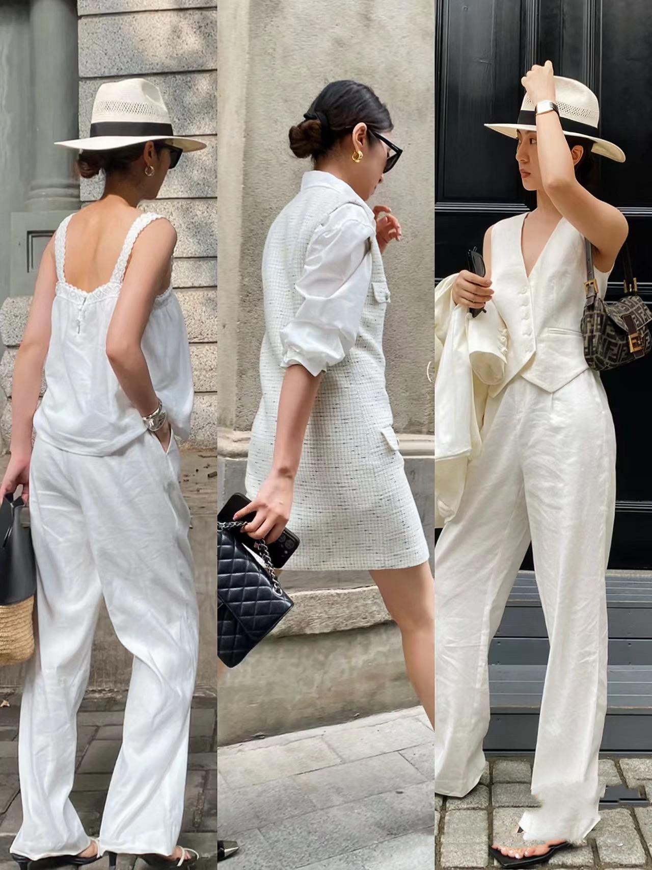 白色馬甲+同款的棉麻闊腿褲,白色吊帶背心+白色闊腿褲,以及白色小香風連衣裙+白色襯衫。
