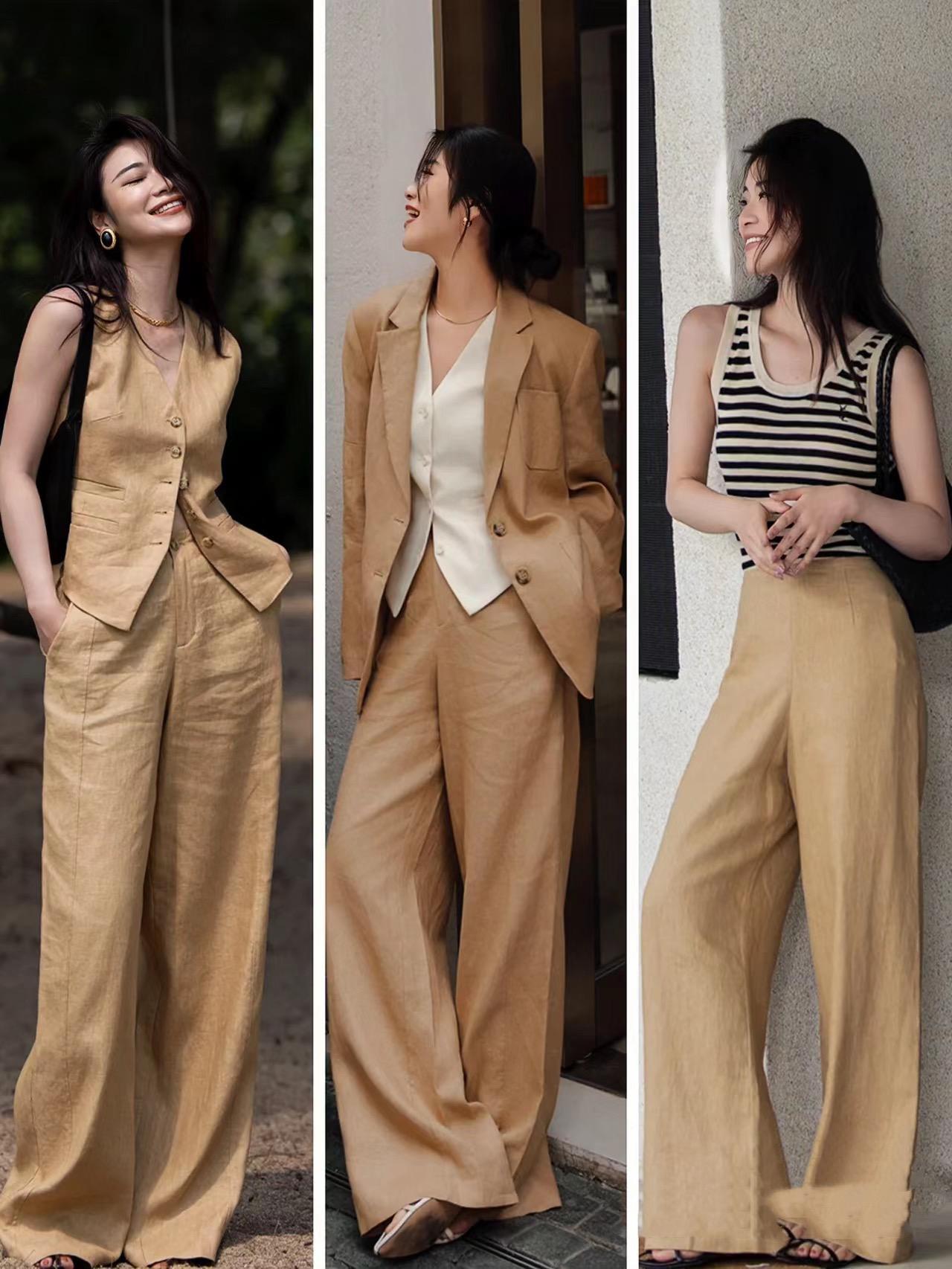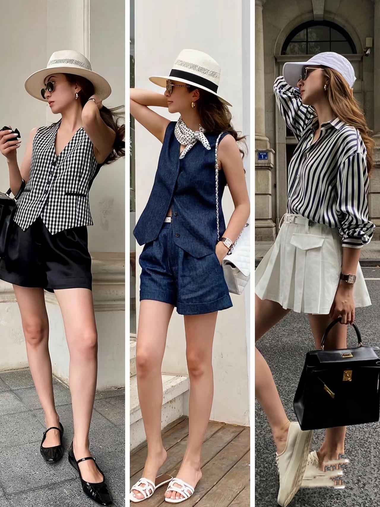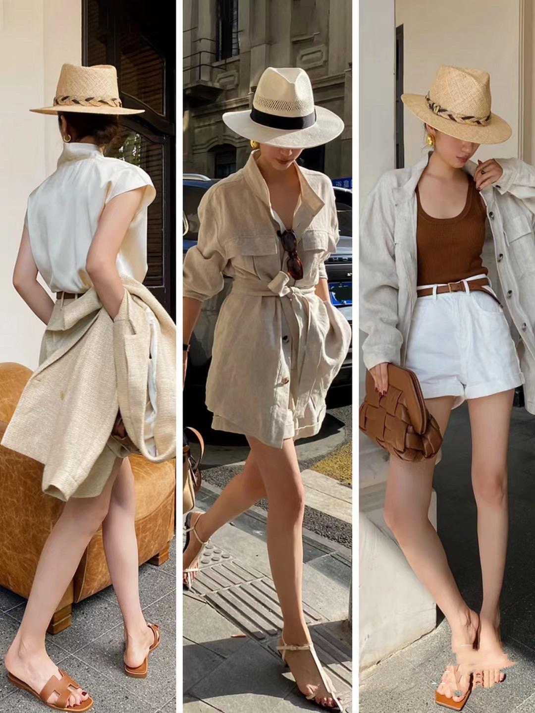 白色馬甲+同款的棉麻闊腿褲,白色吊帶背心+白色闊腿褲,以及白色小香風連衣裙+白色襯衫。