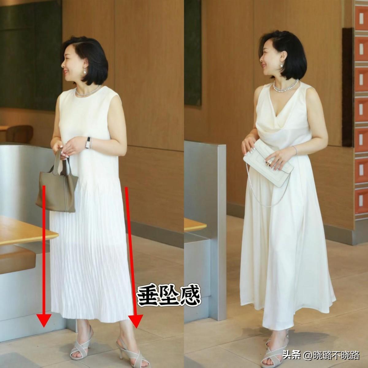 絲綢面料柔軟順滑,並且自帶色澤感,用於長裙當中垂感十足,能夠很好的延伸下半身的比例,裙長超過小腿,能夠輕鬆隱藏住下身短板。
