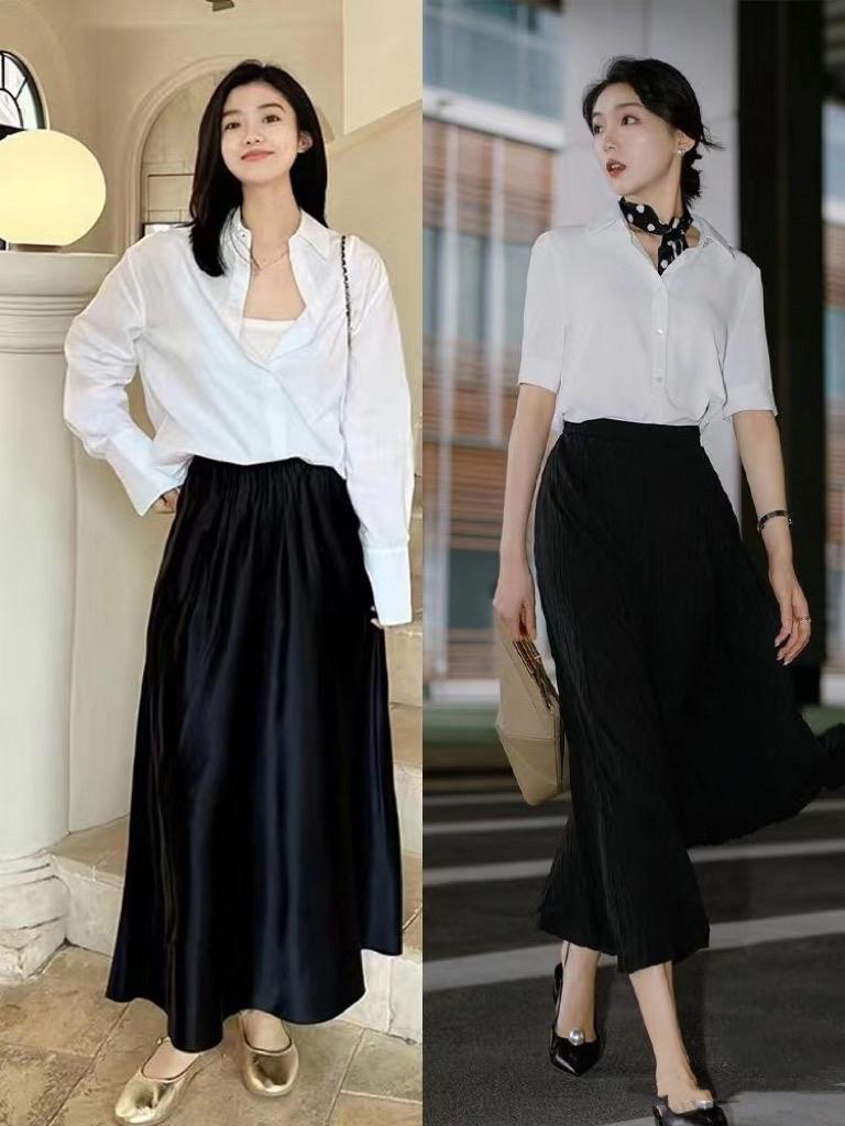 上班通勤的日子,就穿白襯衫+黑色半身裙吧。