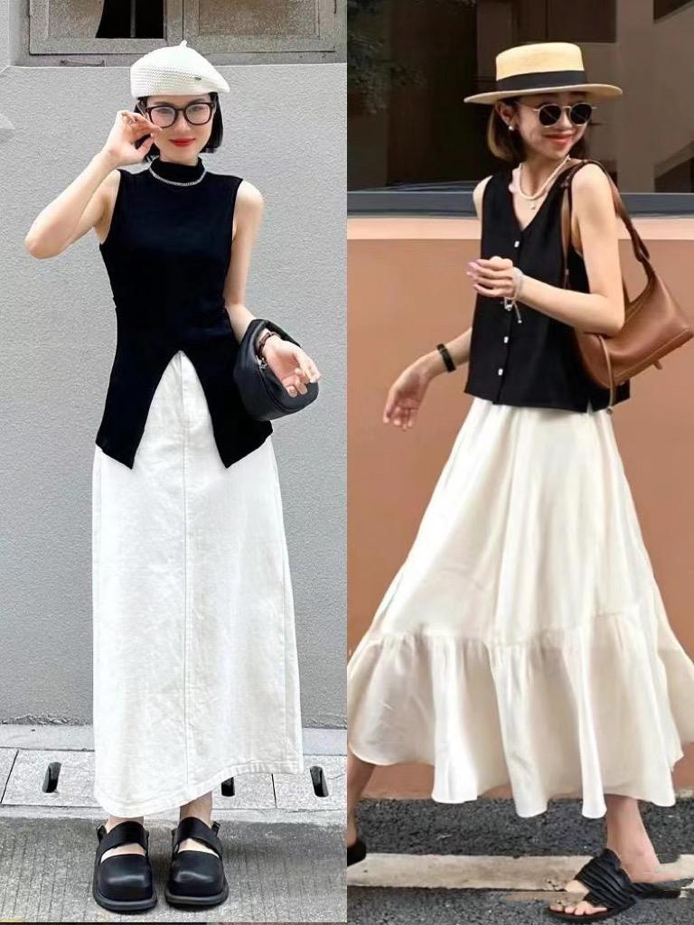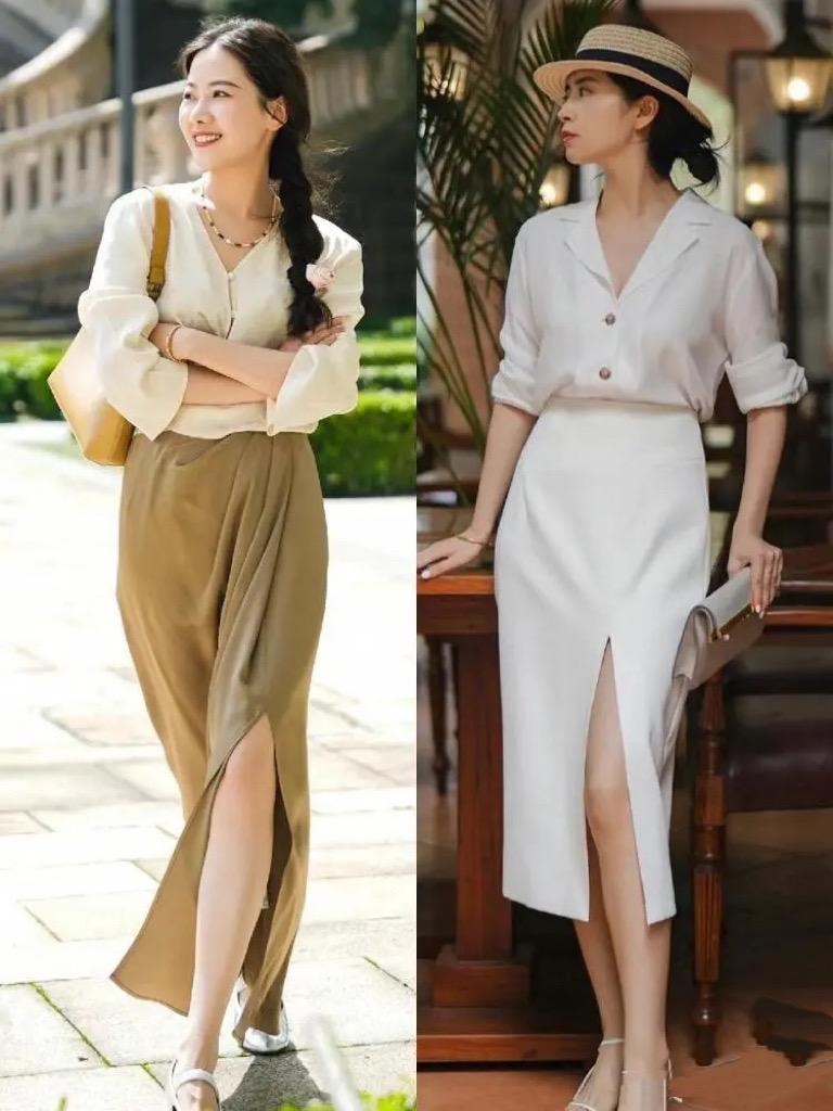 如果穿着半身裙的話,我們可以搭配相對修身一點的上衣。