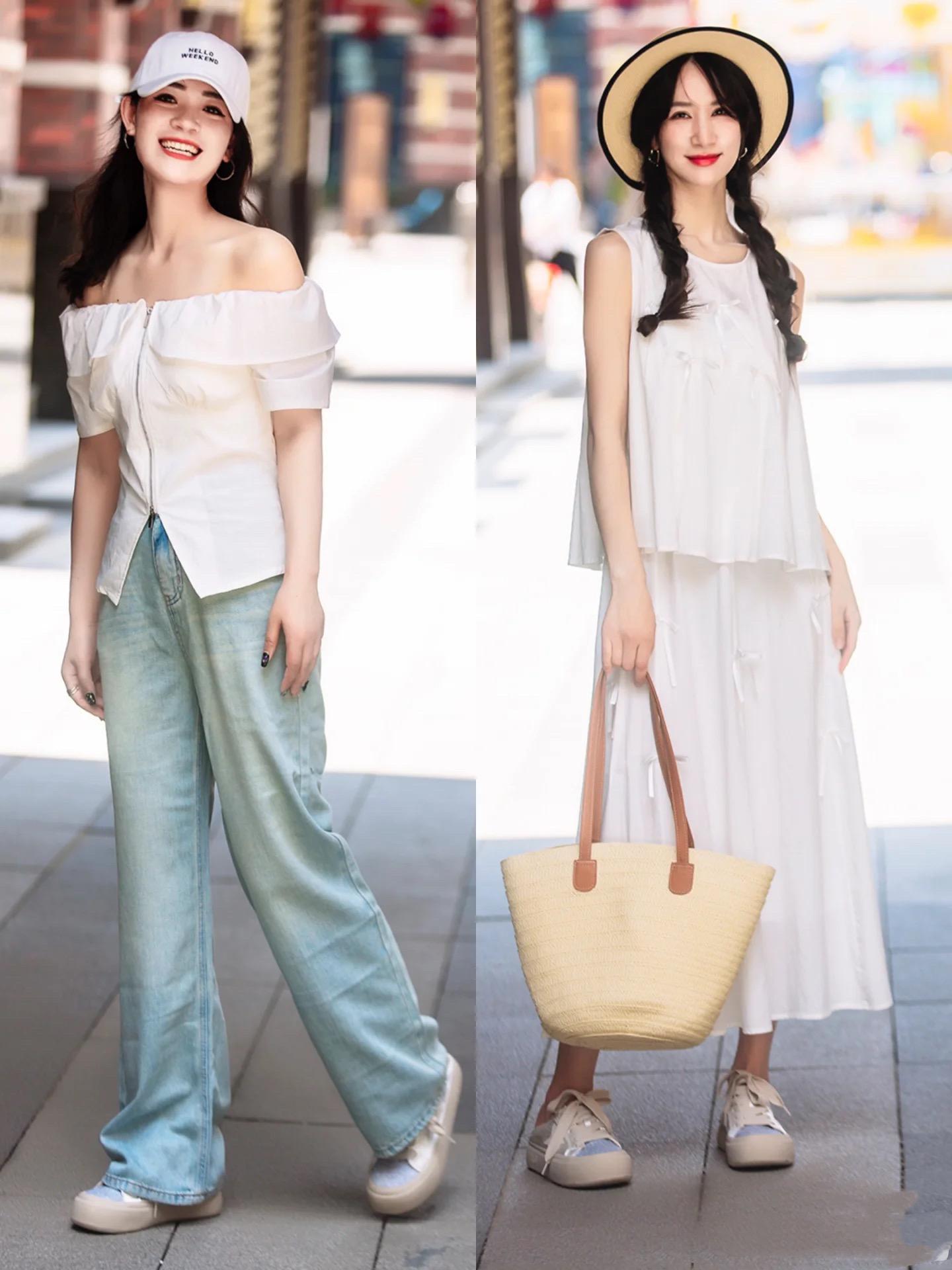 比如一字肩的白色上衣,倒V形的開口,穿起來時髦又洋氣。