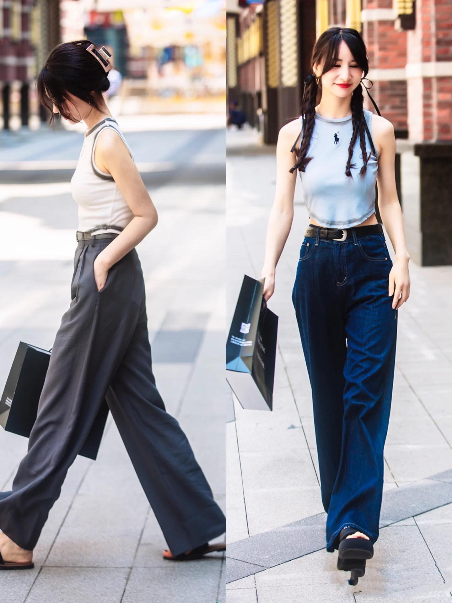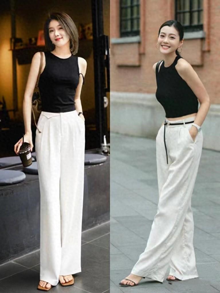 比如無袖的小背心,配上高腰的西裝褲,簡潔高級又非常的清爽。高腰褲酷颯洋氣、也可以修飾我們的腿型。