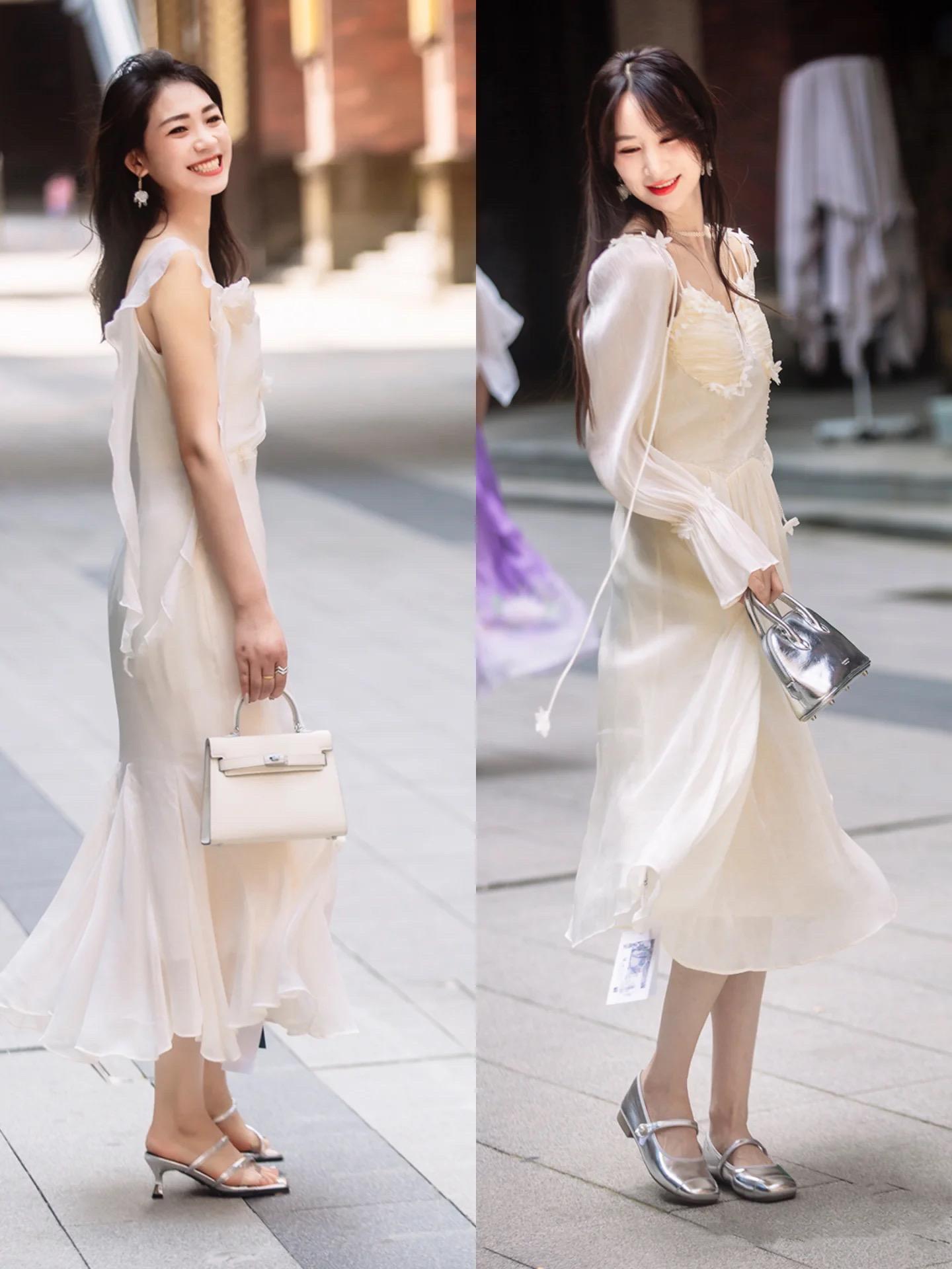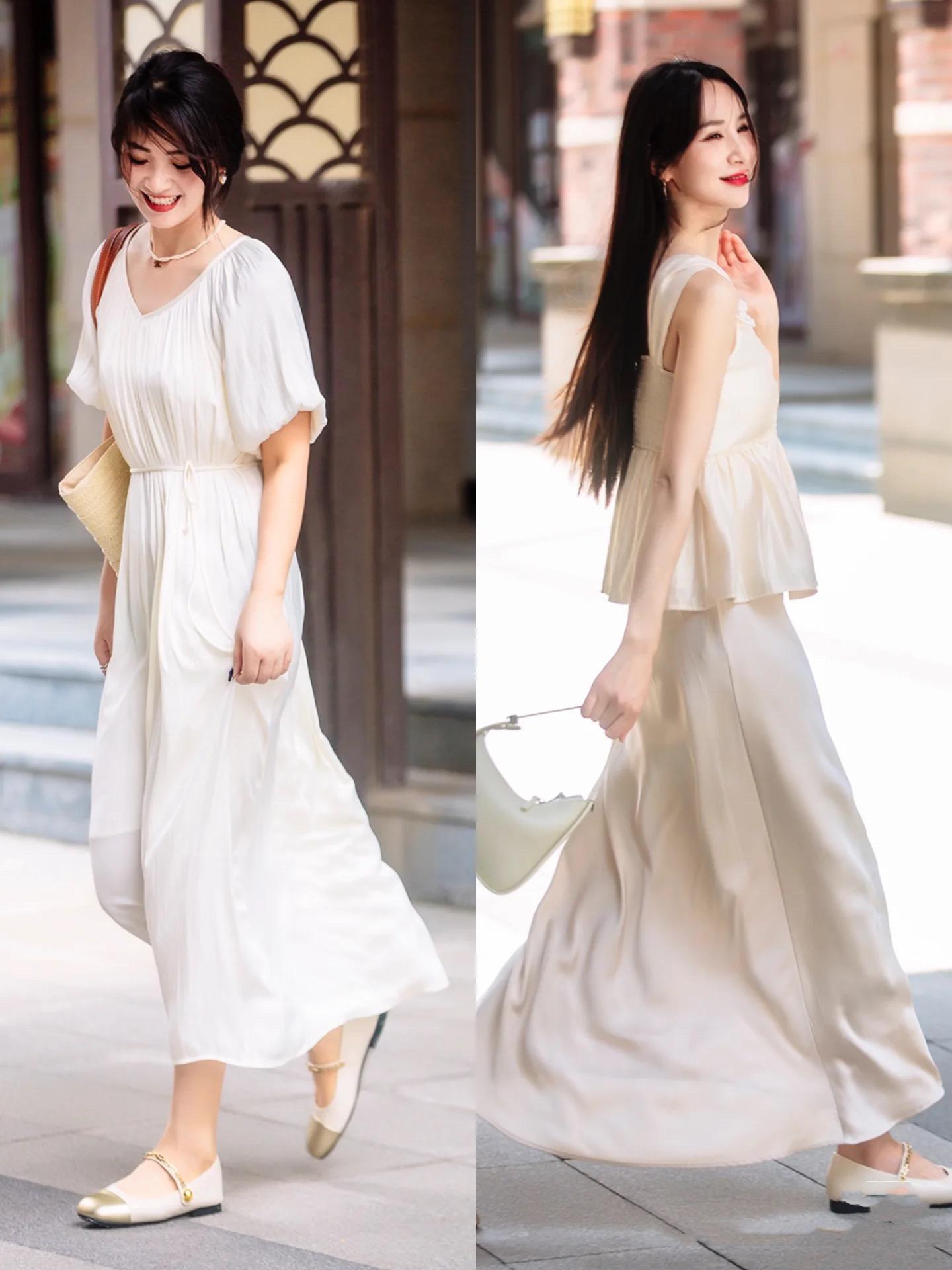 寬鬆一點的白色連衣裙、或者醋酸面料的套裙,穿起來都格外的溫柔。