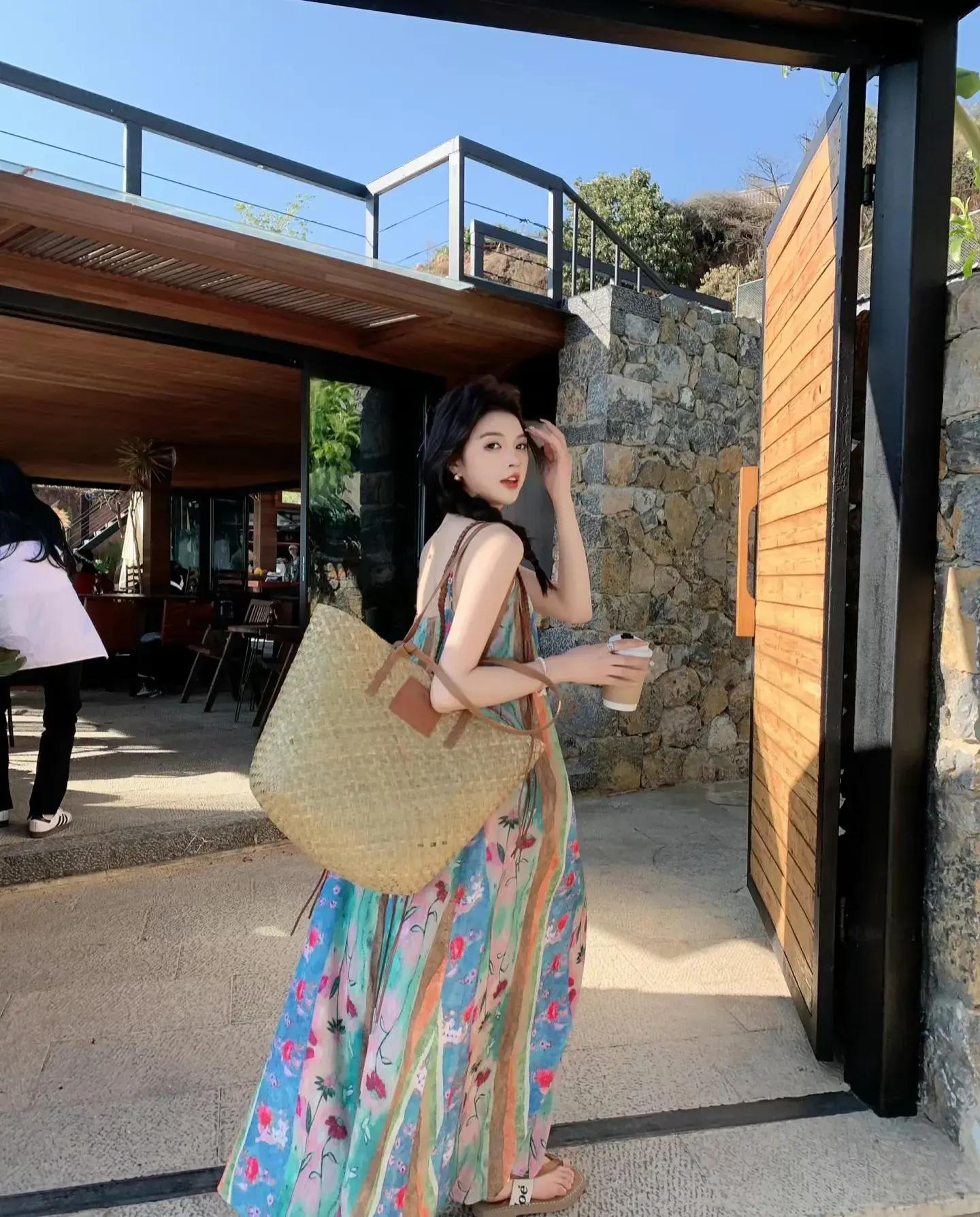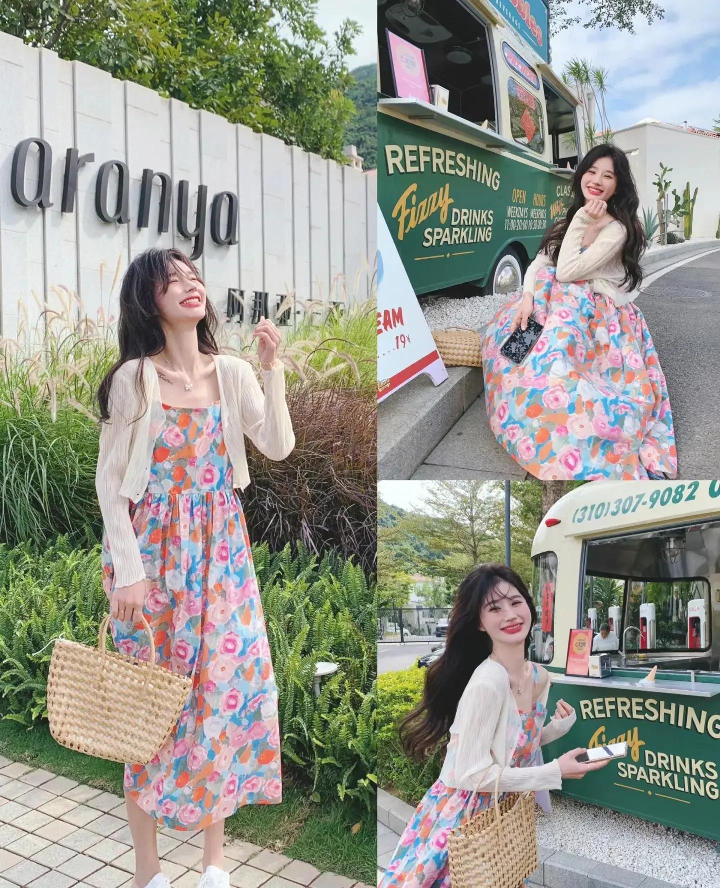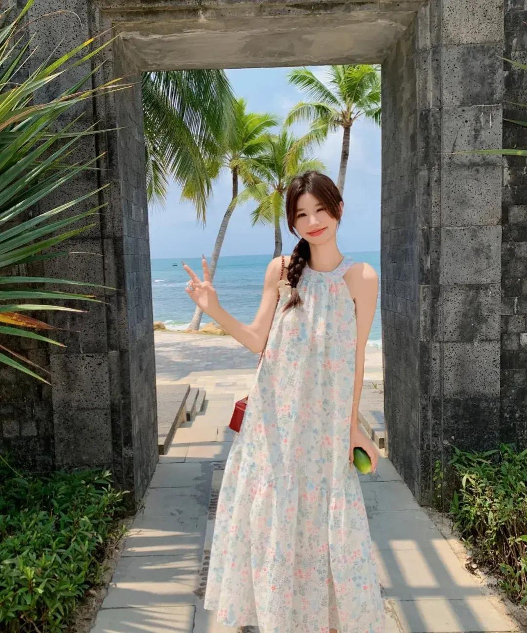 誰能想到這種大印花款式的裙子穿起來竟然也這麼美呢?完全沒有想象中的俗氣或者是土氣。吊帶款式,最適合悶熱的夏天了,清涼舒適又帶着不易察覺的小性感,你可以搭配一件防曬衫或者是薄款的針織開衫開配,這樣就更美了!