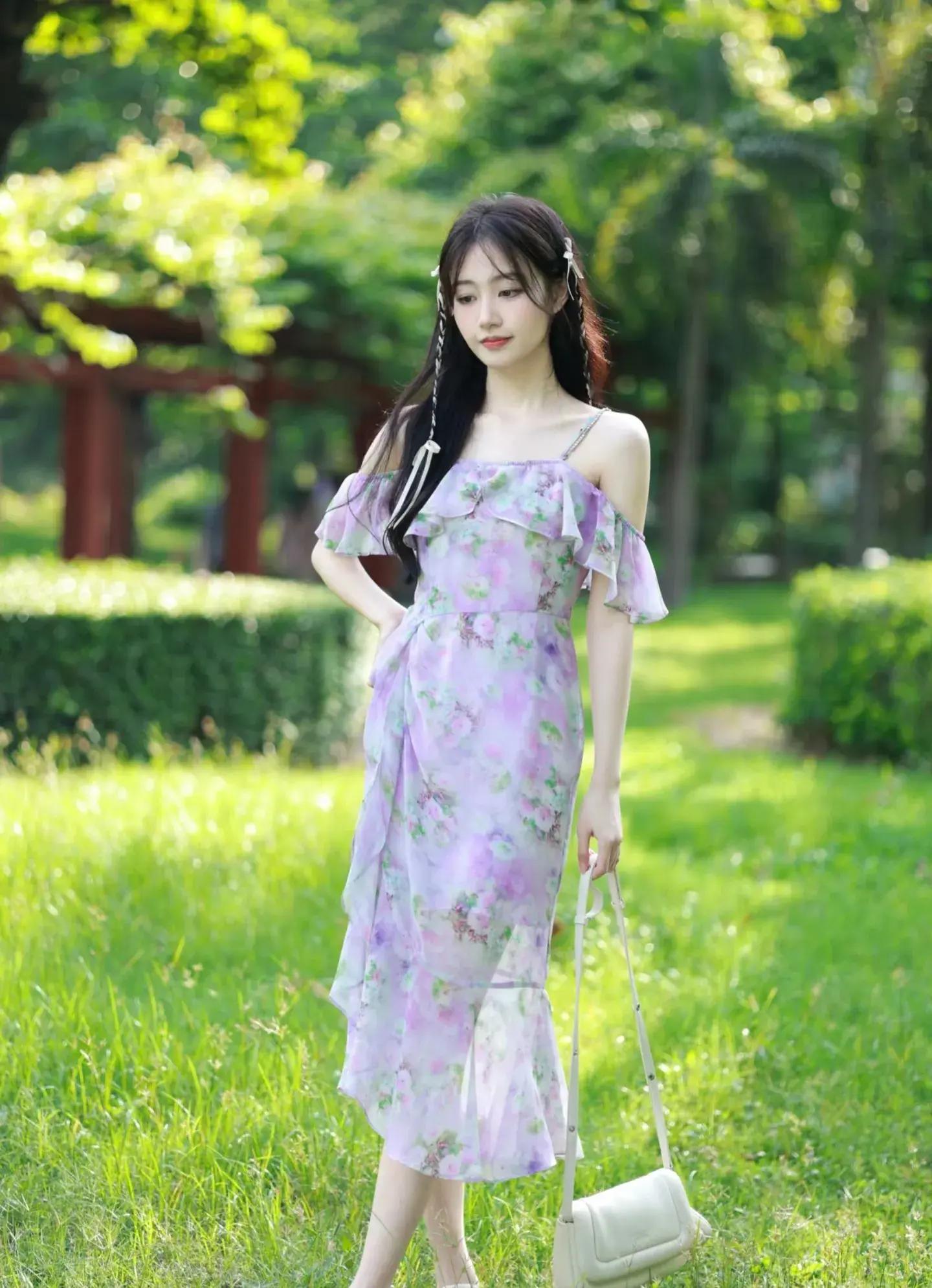 就拿這款雪紡吊帶花裙子來說吧,材質很輕盈,淡淡的紫色,加上花圖案,太美了。