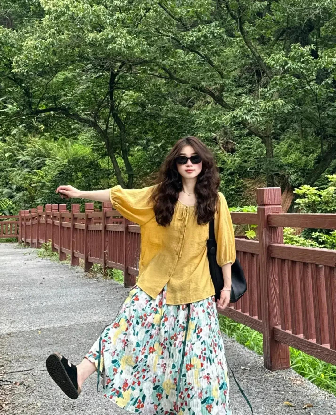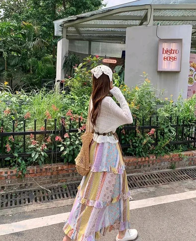 下身搭配一條半身花裙子,這種寬鬆的裙身,完全不挑身材的,誰穿都很顯瘦。