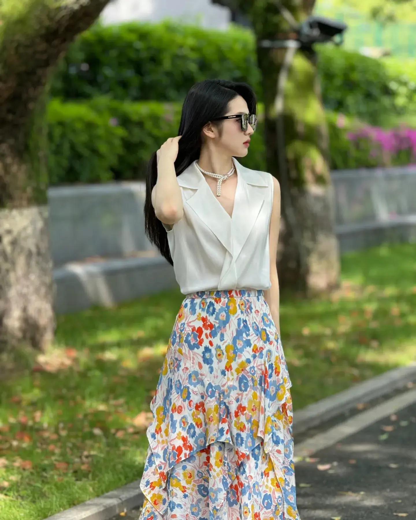 現在天氣那麼熱,一定要爲自己入手一件無袖衫,白色簡約款無袖襯衫,不僅百搭還時髦氣質。深v 領口設計,有助於拉長脖子線條,襯托出小臉蛋,下身搭配一條碎花半身長裙,這也太美了,對不對。