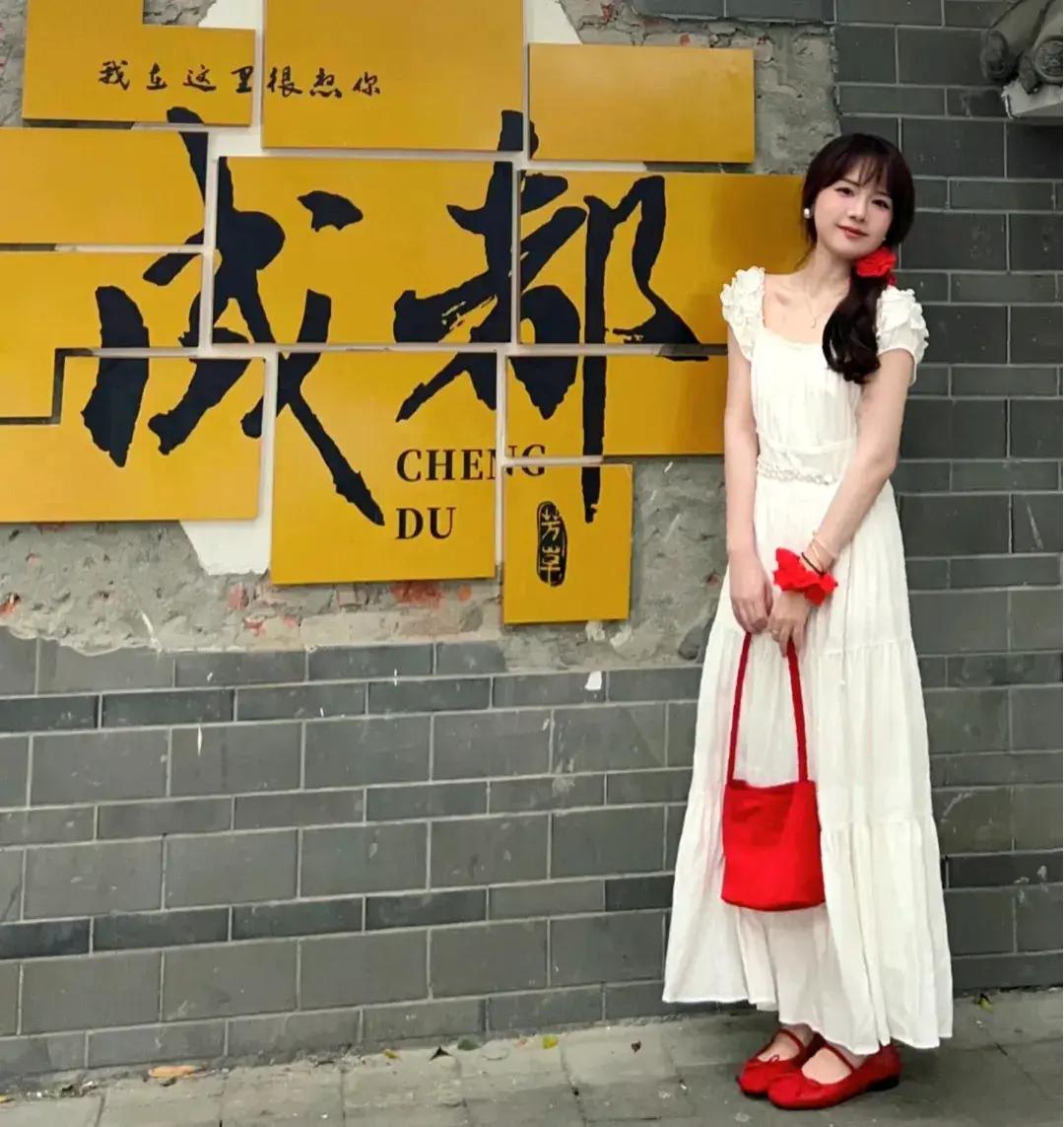這簡直是白月光裙子啊,在夏天,裙子還是長一點更好,方領的設計,露出精緻的鎖骨,太精緻了,還帶着一些小性感,搭配紅色也太明媚了,紅色的瑪麗珍單鞋和包包,以及頭飾都絕了。