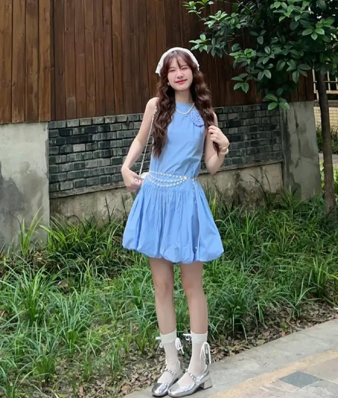 蛋卷頭和花苞裙也太配了吧?這麼一整套看起來乖得很,低飽和度的藍色,很襯膚色和顯白,覺得單調的話,可以試着像這位博主一樣,在腰間增加一條珍珠腰帶點綴,實在是太美了。腳下踩着一雙銀色瑪麗珍單鞋,瞬間提升了氣質。
