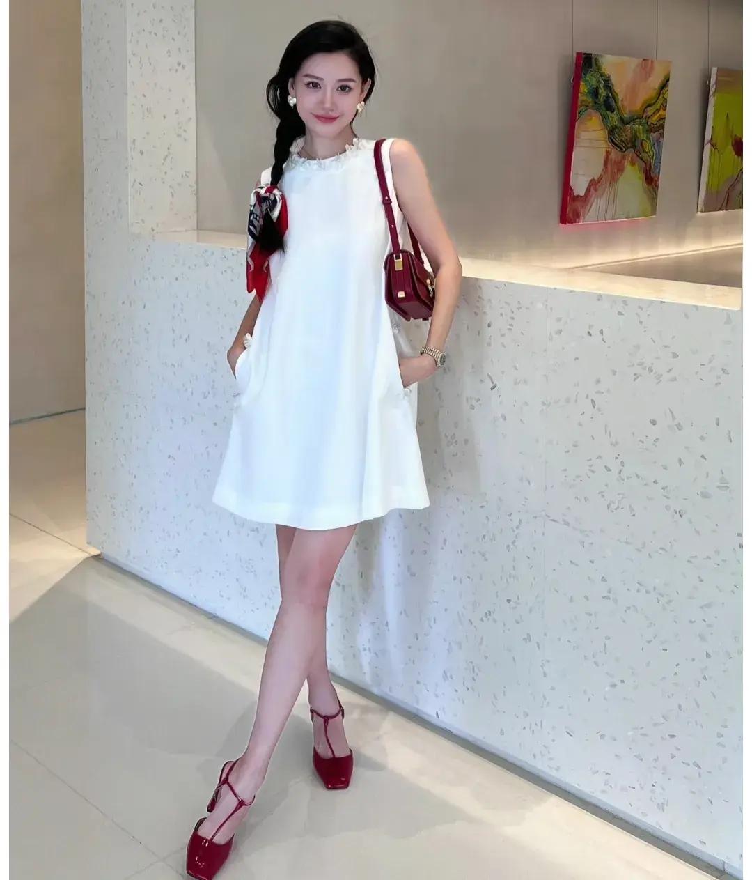紅白配可太好看了,白色無袖連衣裙,很簡約的款,怎麼搭配都好看。寬鬆的裙身,不管是胖還是瘦都可以穿得很時髦,輕鬆舒適又自在。紅色瑪麗珍單鞋和挎包進行了呼應,不僅吸晴還亮眼。