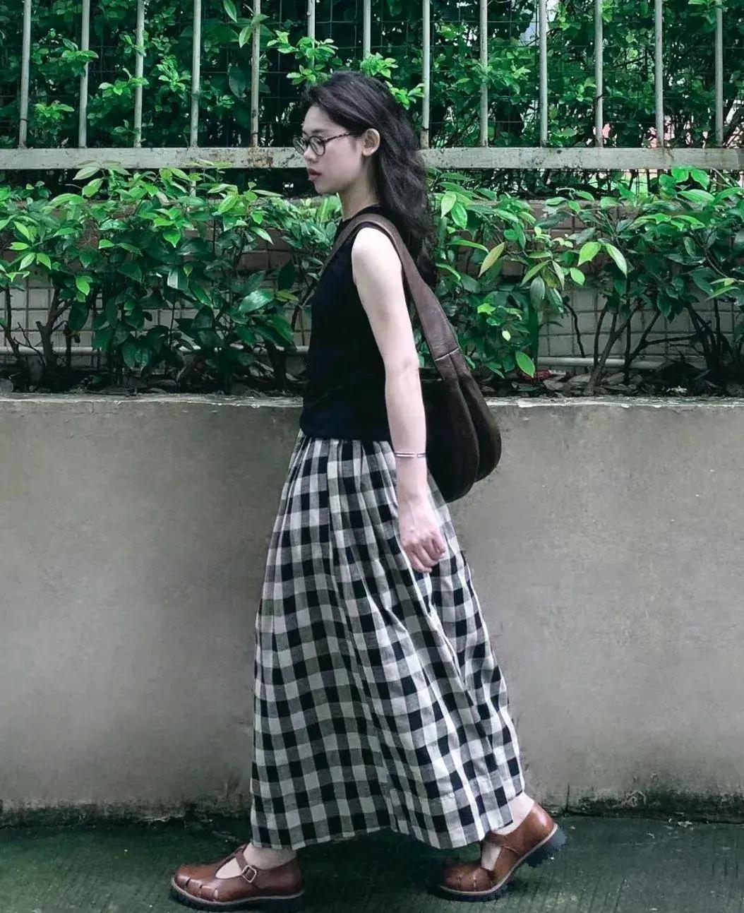 不知道你們有沒有發現,小個子女生是真的很適合復古文藝範的穿搭啊,簡約經典的黑色無袖背心,搭配黑白格子半身裙,上下的版型都是寬鬆的,喜歡這種鬆弛和隨意的組合,頗有文藝氣息的一套。