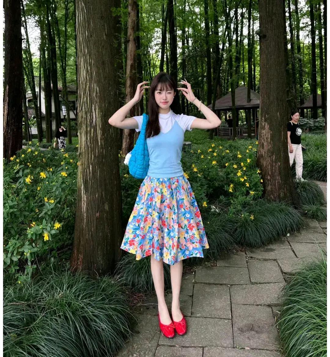 夏天就應該穿得五顏六色一些,所以給自己入手一條花半裙真的太合適了,長度剛好在膝蓋位置左右,對於小個子女生來說也是非常友好的。紅色的鞋子,對整個穿搭都起到了很好的點綴,太吸睛了。