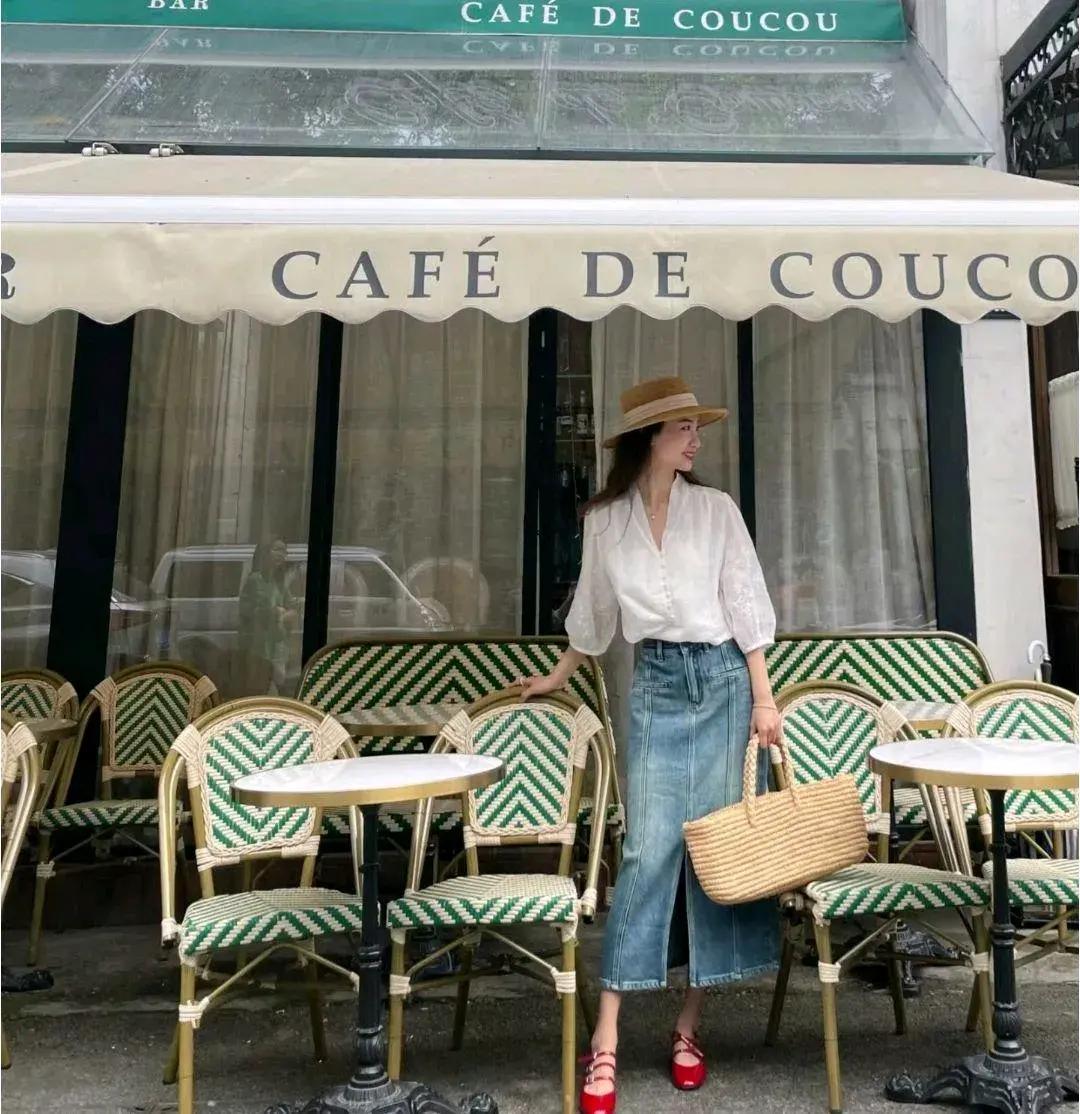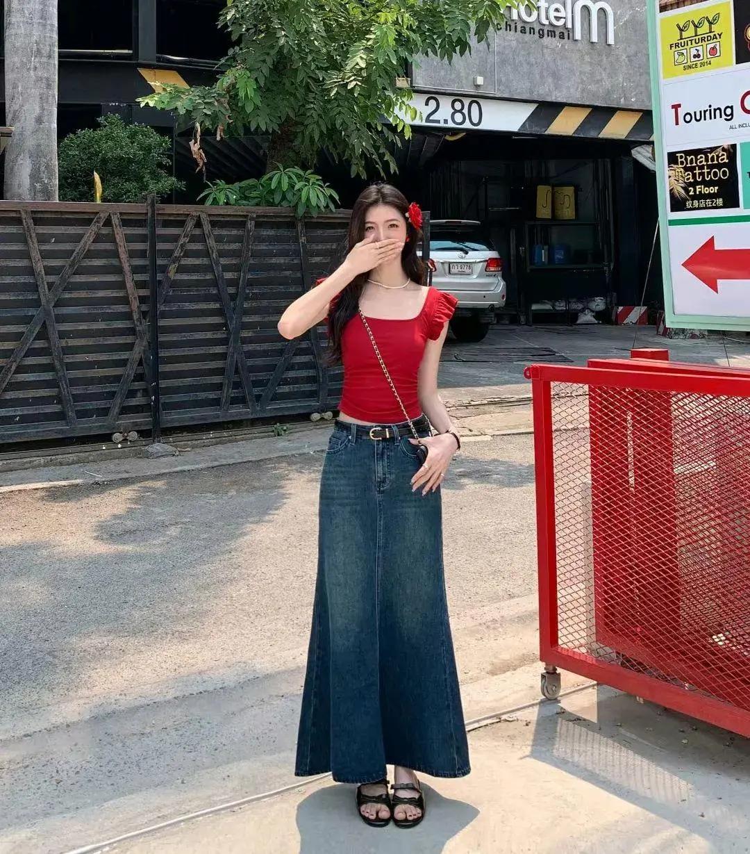 搭配牛仔半身長裙,裙襬開叉的設計,真的太拉腿部線條了,臉上踩着一雙紅色單鞋,紅藍白的配色組合,高級感十足。