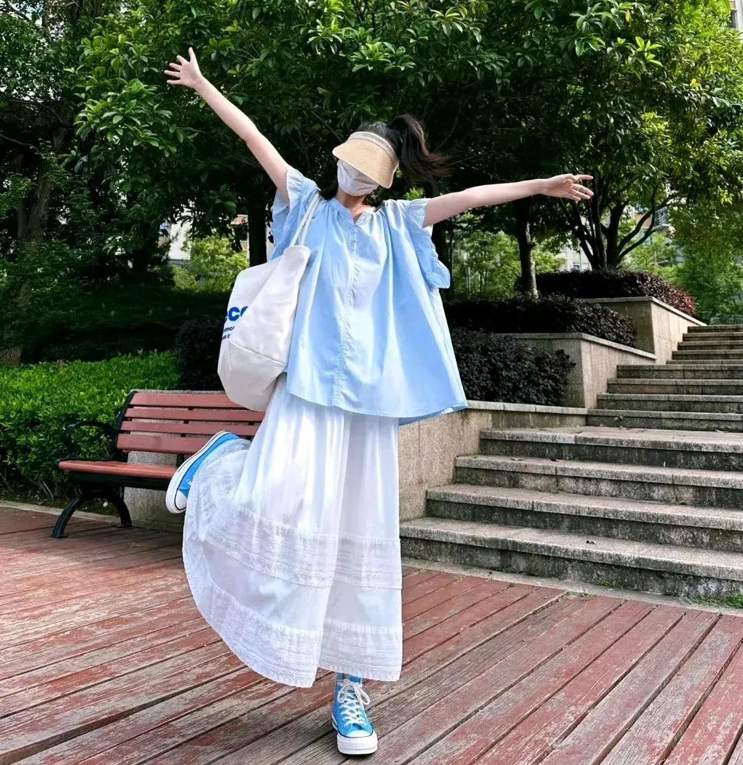 這一套也太好看了吧?是夏天的顏色啊,白色泡泡袖襯衫+花半裙,溫柔又充滿小清新感,這種版型的半裙,對身材有着極佳的包容性,可藏肉顯瘦了,任誰看了都不迷糊吧?