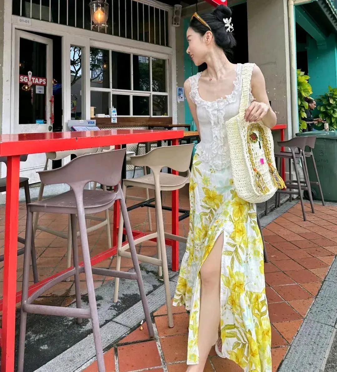 滿滿度假風的一套花裙子穿搭,不管是約會,還是逛街都可以這麼穿。明豔靚麗的顏色,加上開叉的裙襬,大長腿瞬間就打造了,上身搭配一件白色背心,很是清涼又帶點小性感。