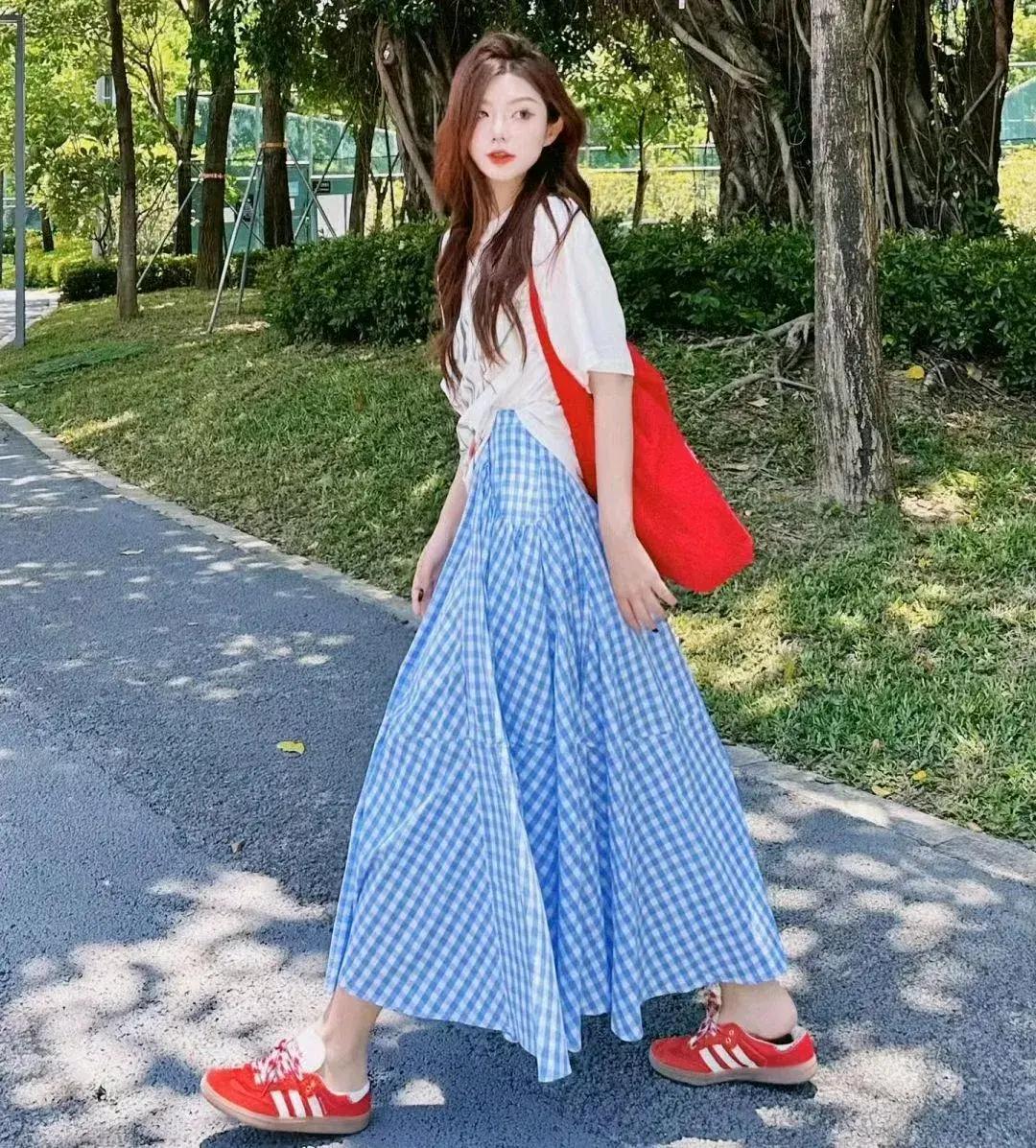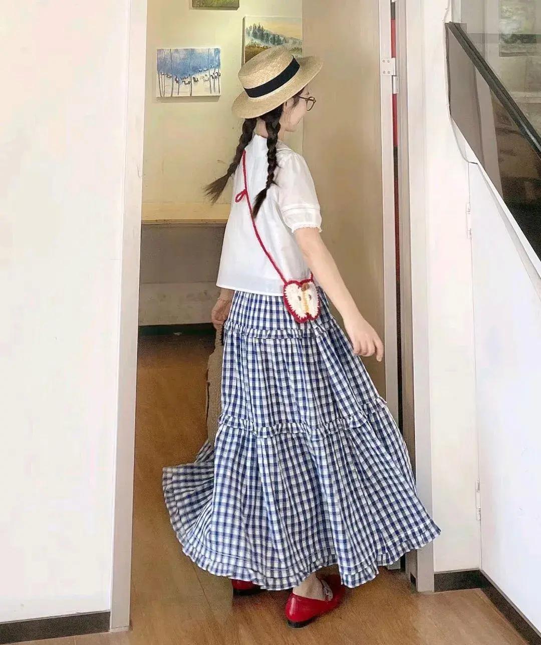 藍白的搭配就是很適合夏天的,這條藍色格子半身長裙,看起來也太美了吧?裙子版型有些偏a字形狀的,無論你是什麼身材都可以輕鬆遮掩起來,特別是梨形身材的姐妹,穿起來可顯瘦了,簡單配一件白色短袖t就可以了。