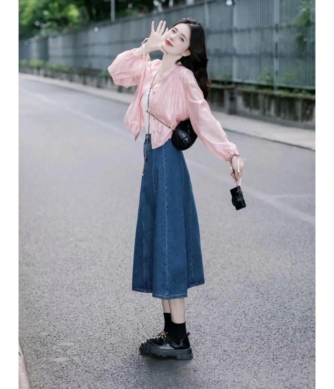 一眼就很心動的溫柔粉,低飽和度的配色,真的完全不挑人穿,黃黑皮都可以駕馭。與牛仔藍半身長裙相配,看起來就非常減齡和青春,少女範十足!