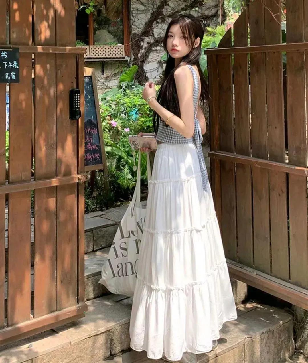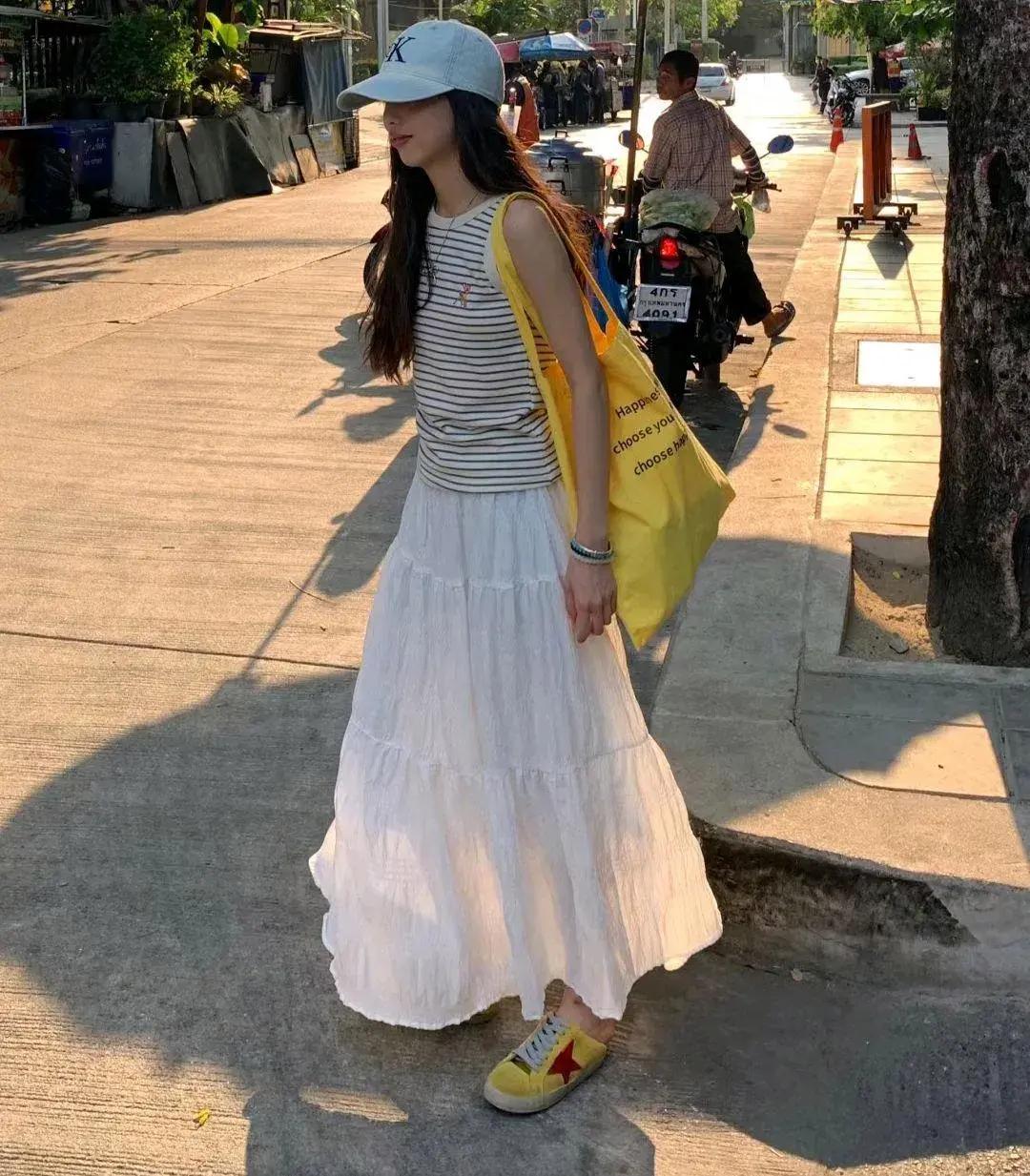 夏日充滿小清新的白色半裙,可別覺得自己駕馭不了這種長款,高腰設計,可以很好拉長下身比例,視覺上也能打造出高挑感。