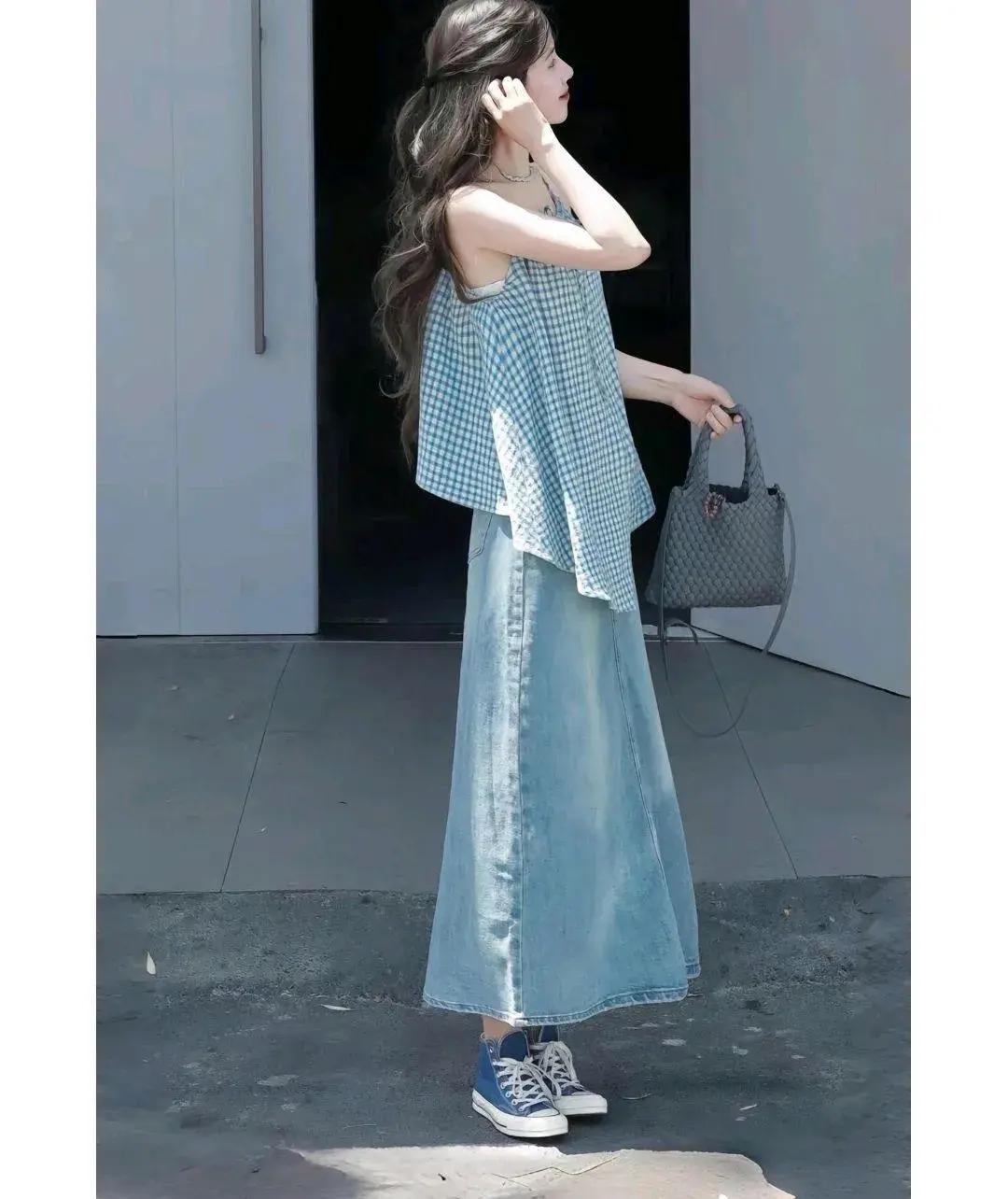 一套很適合夏天的穿搭,格子吊帶上衣+牛仔半身長裙,吊帶的設計是不規則的,看起來還蠻個性的,寬鬆的版型,對身材沒有一點約束感。