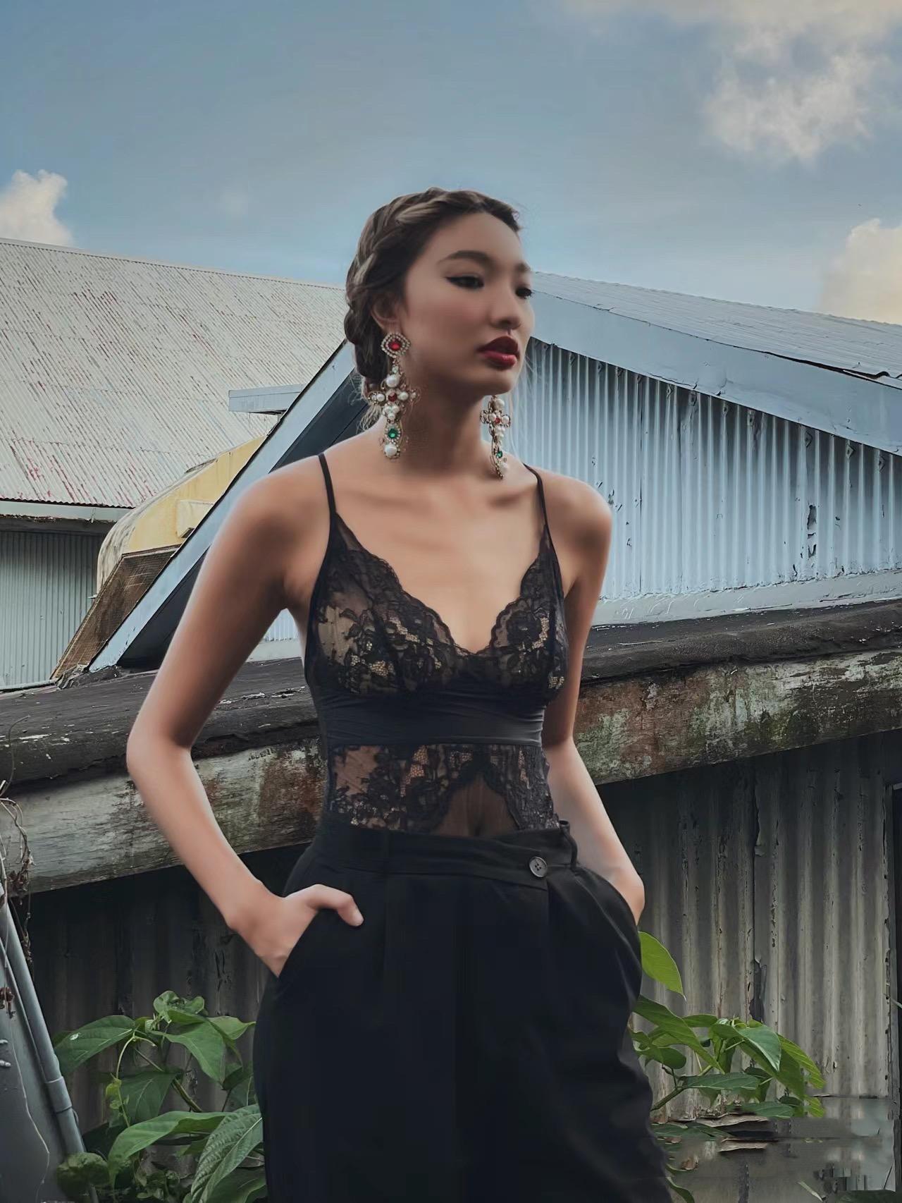 以透視感的黑色蕾絲,融入到肚兜款的吊帶上衣,搭配魚骨束胸的設計,給人一種格外震撼的美,性感、魅惑、熱辣、不羈,更適合熟女穿搭。