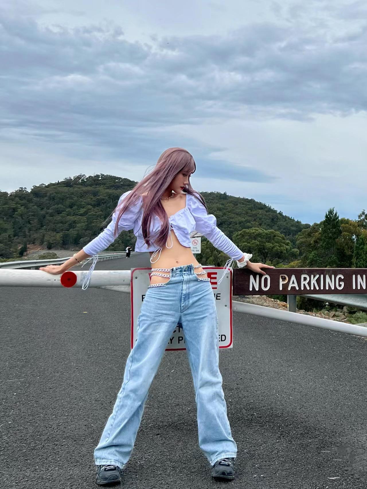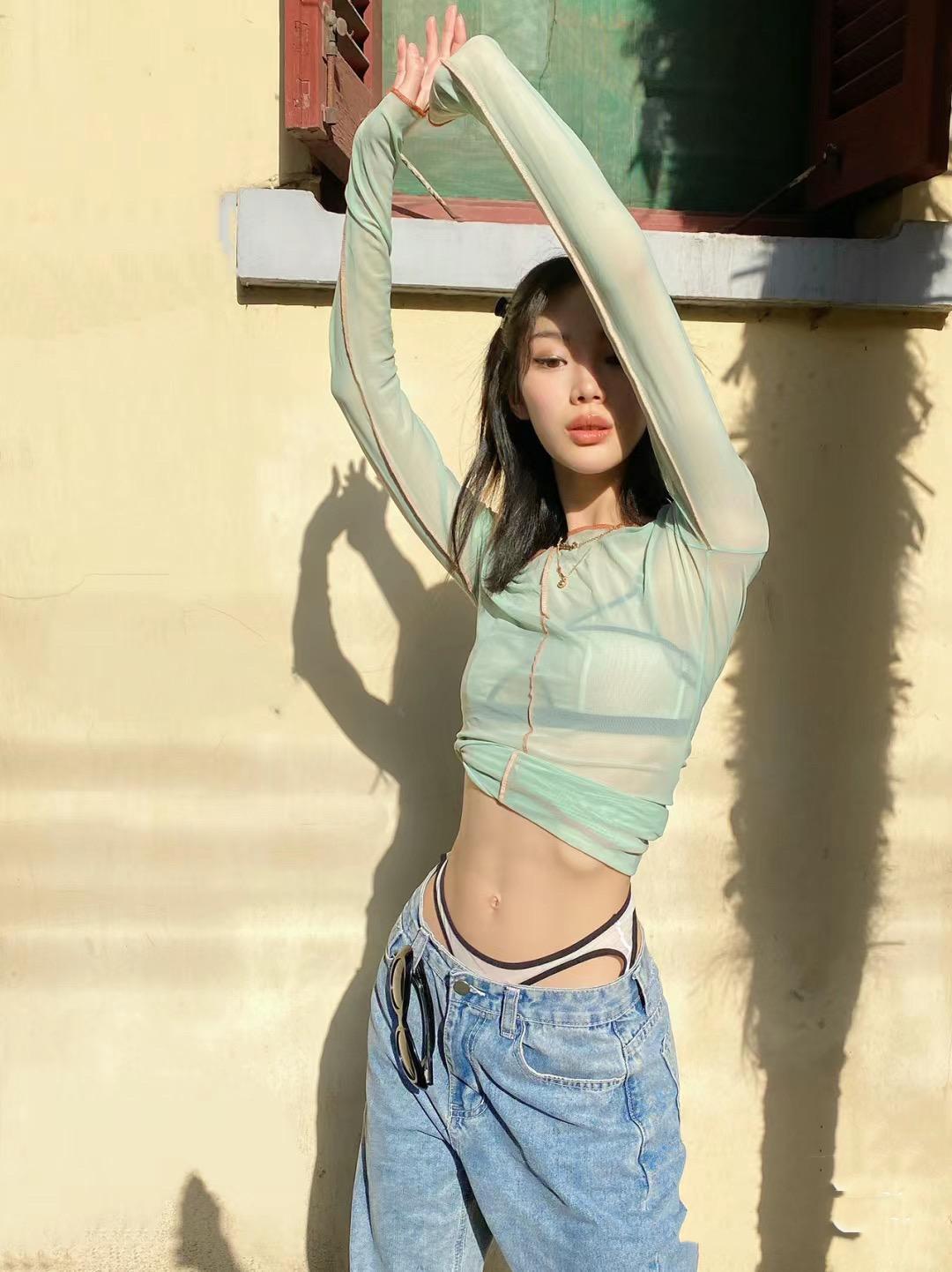 穿着透視感的肚兜,配上寬鬆的露胯牛仔褲,撞色的內褲邊豐富了穿搭層次,也更加洋氣惹眼。這種不遮掩的性感、盡收眼底。