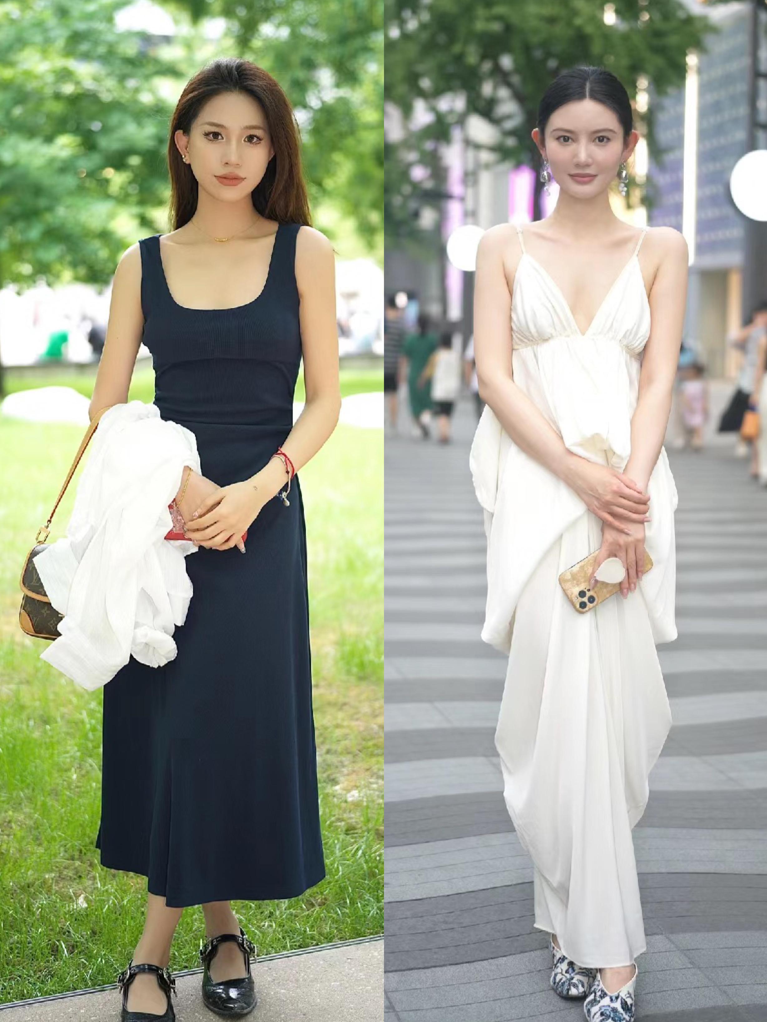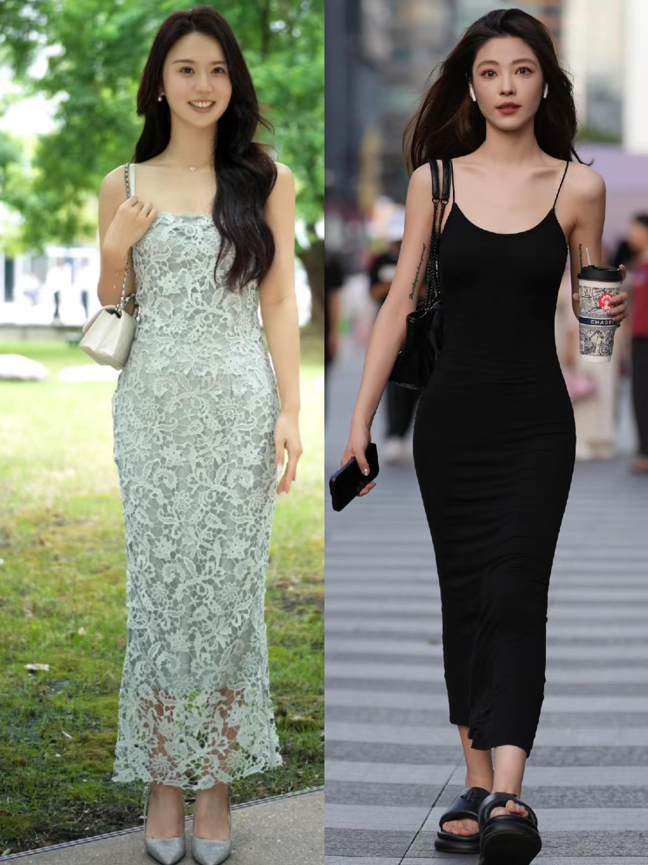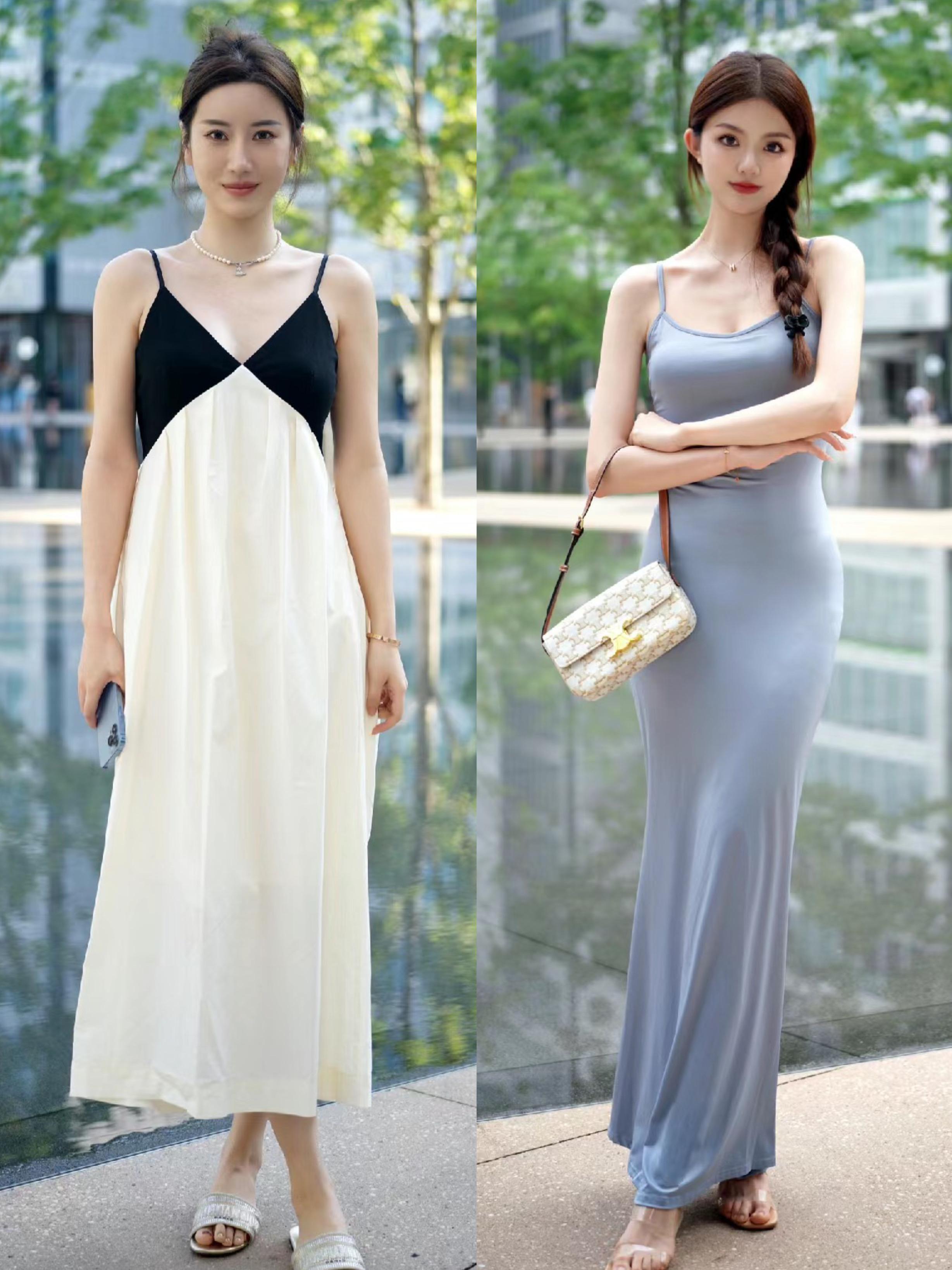 黑白撞色的吊帶款連衣裙,適合胸部線條豐滿,想要大胸顯小的女生,整體有一種唯美標誌的氛圍。而純色系的吊帶連衣裙,修身剪裁更具性感姿態。