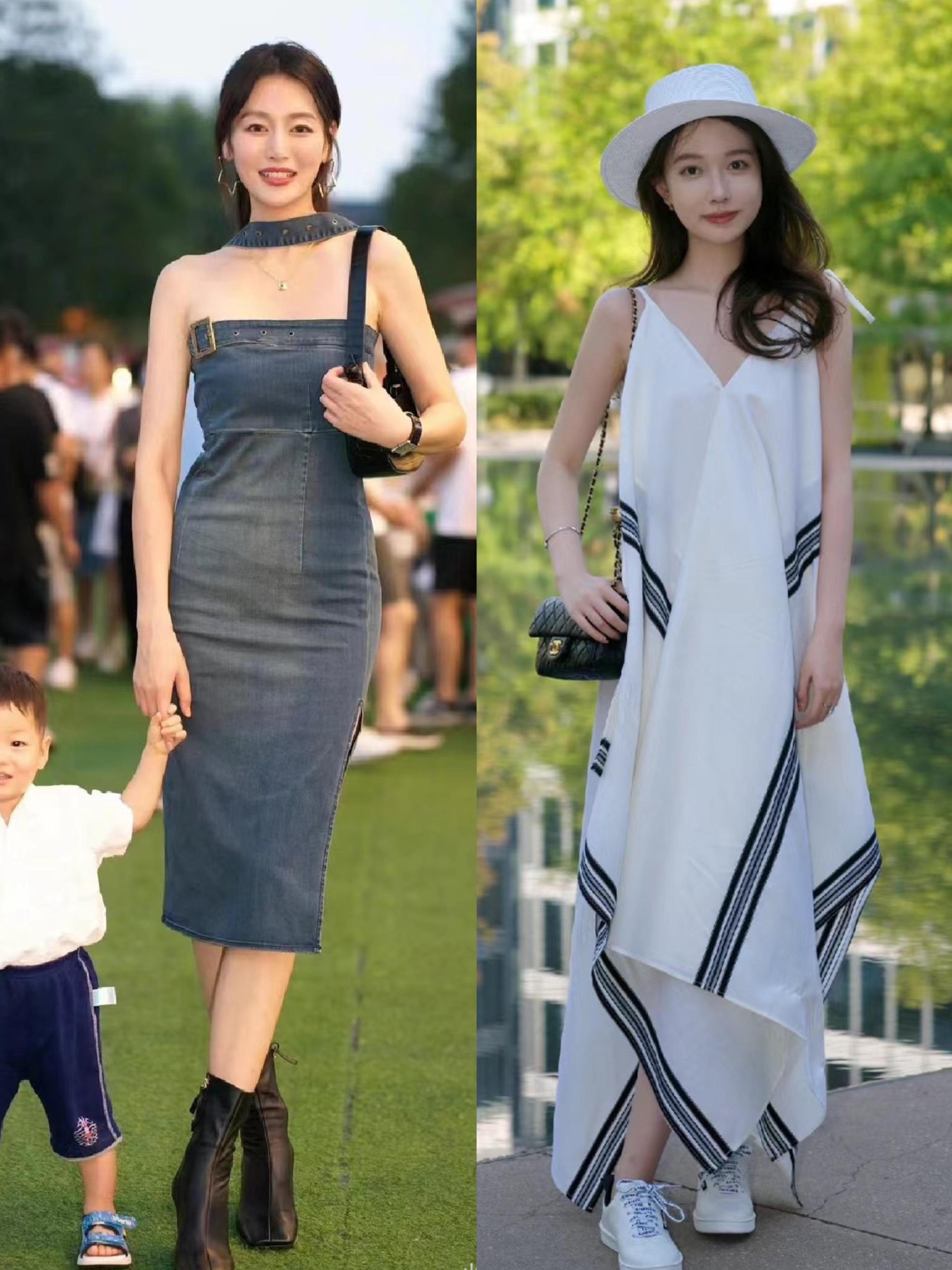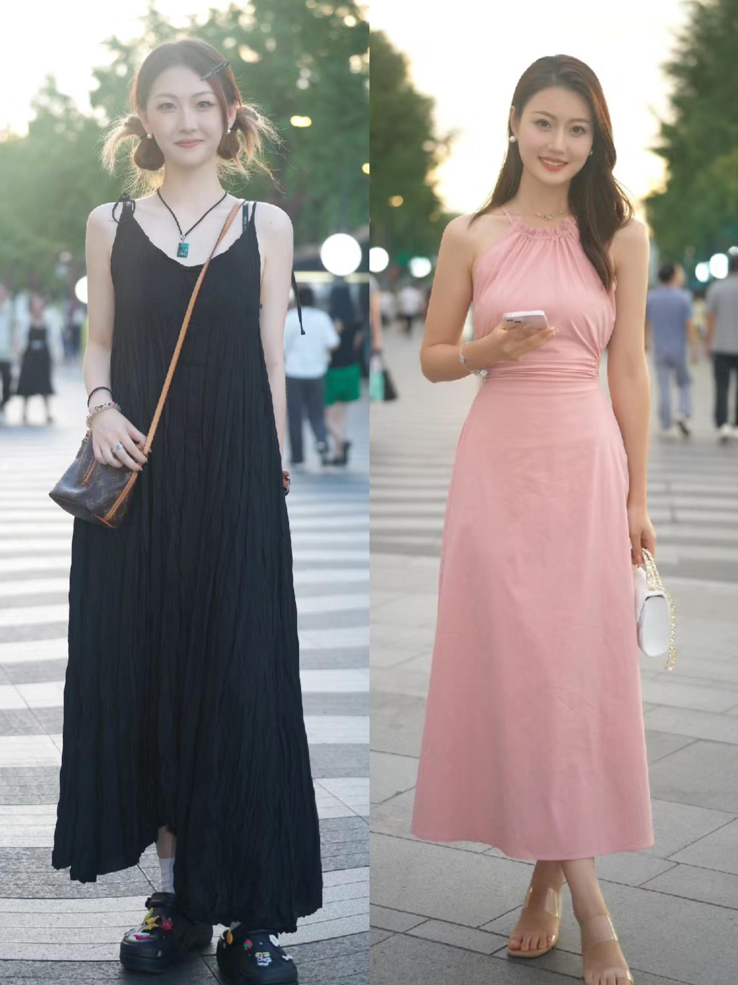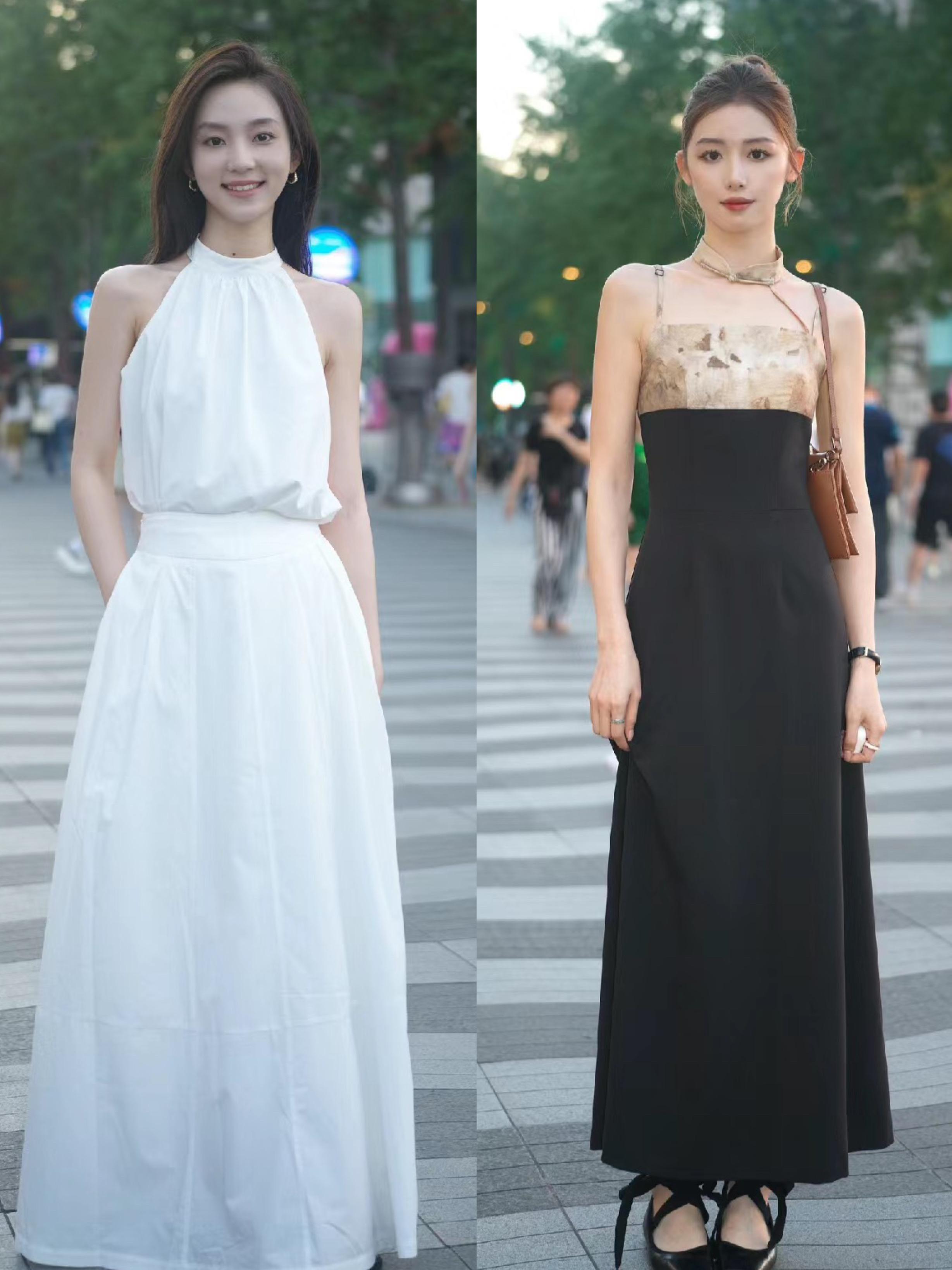 黑白撞色的吊帶款連衣裙,適合胸部線條豐滿,想要大胸顯小的女生,整體有一種唯美標誌的氛圍。而純色系的吊帶連衣裙,修身剪裁更具性感姿態。