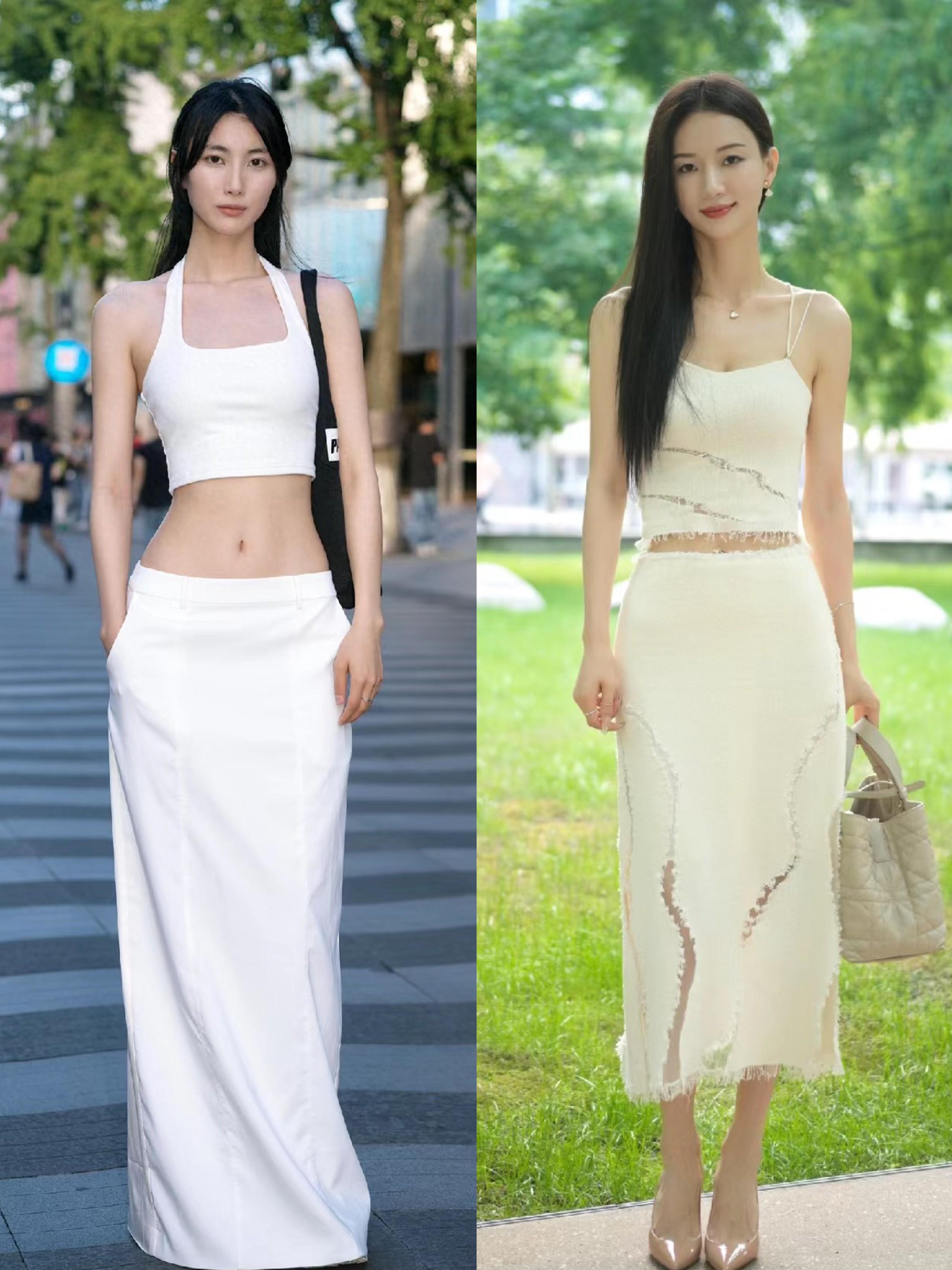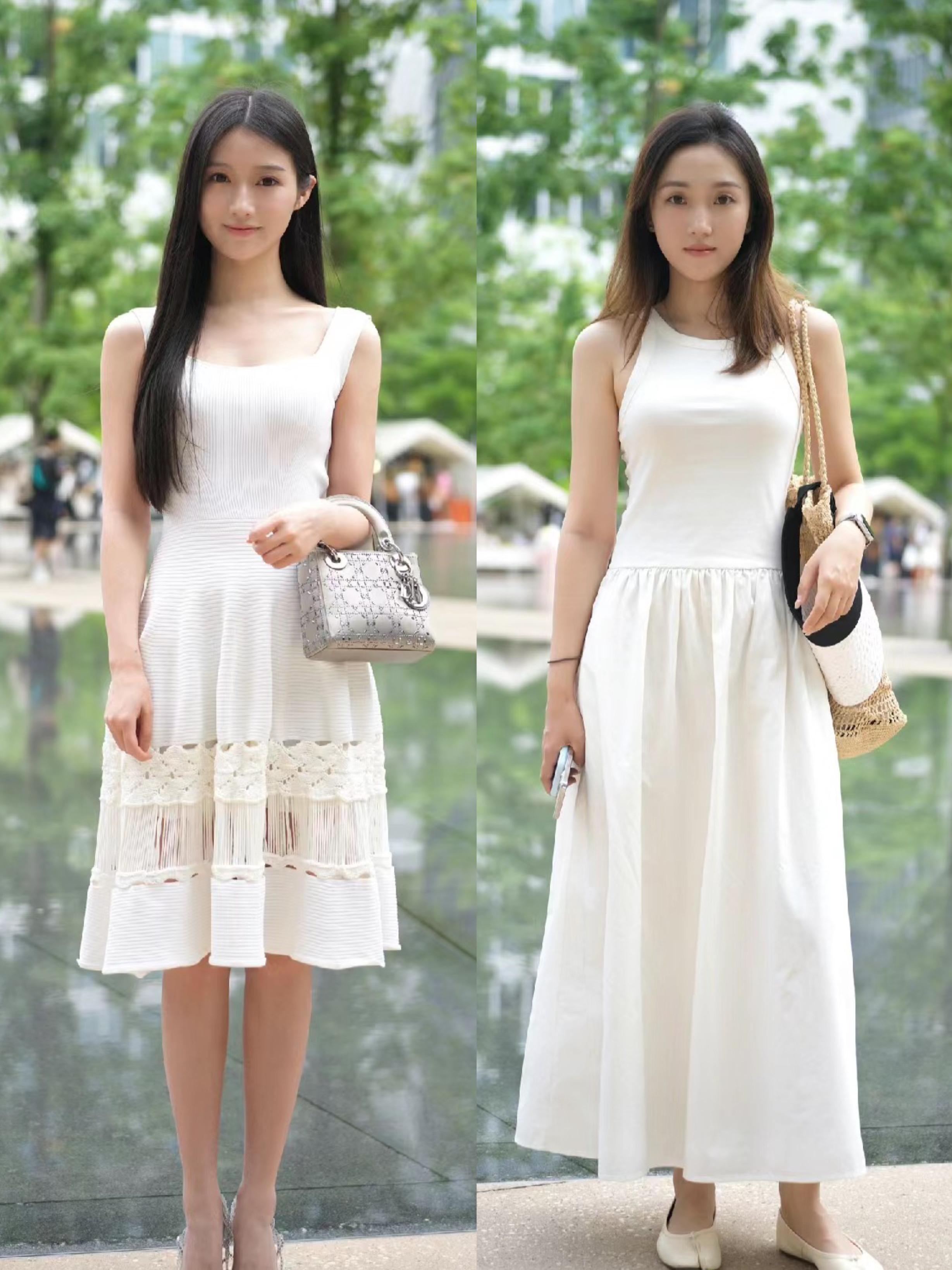 挖肩袖的白色連衣裙,會露出肩部、上臂的線條,對於肩頸線、手臂線條的要求都更爲嚴苛。如果手臂纖細勻稱,可以嘗試挖肩袖的掛脖吊帶裙。