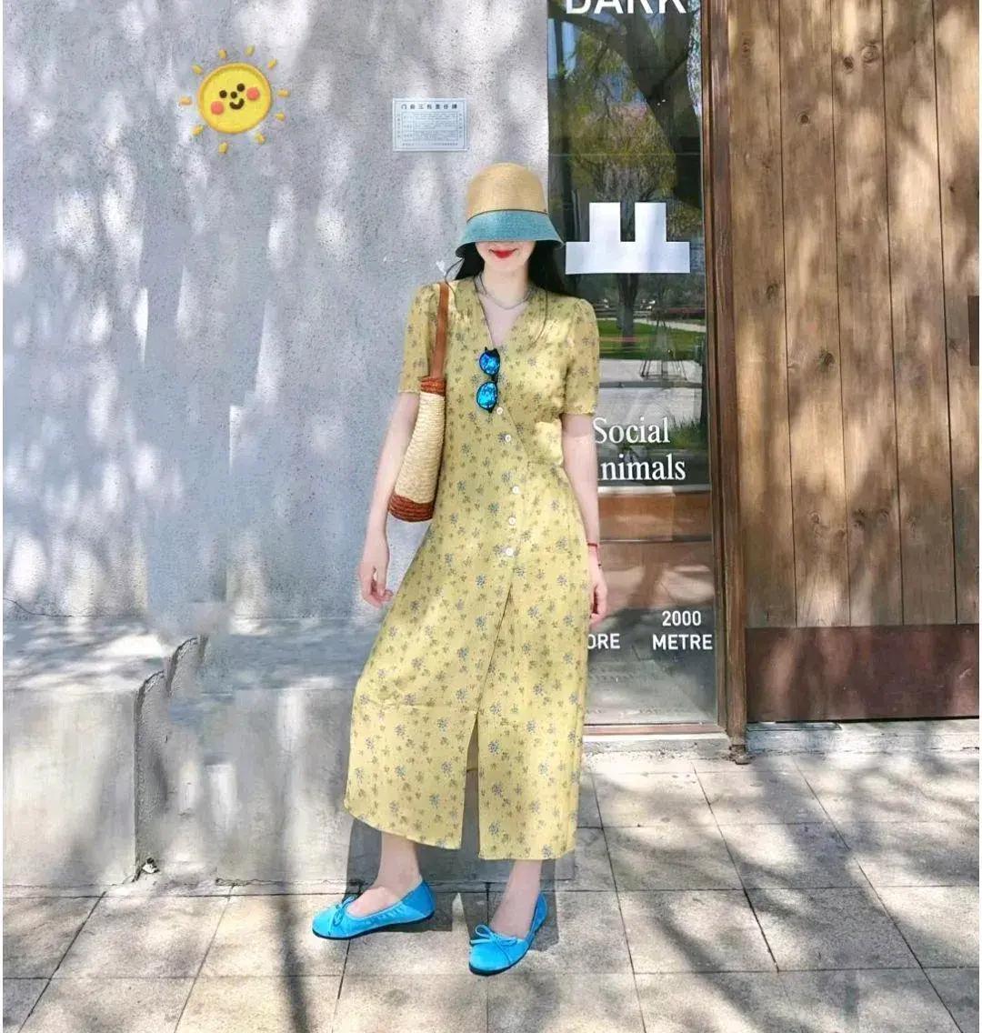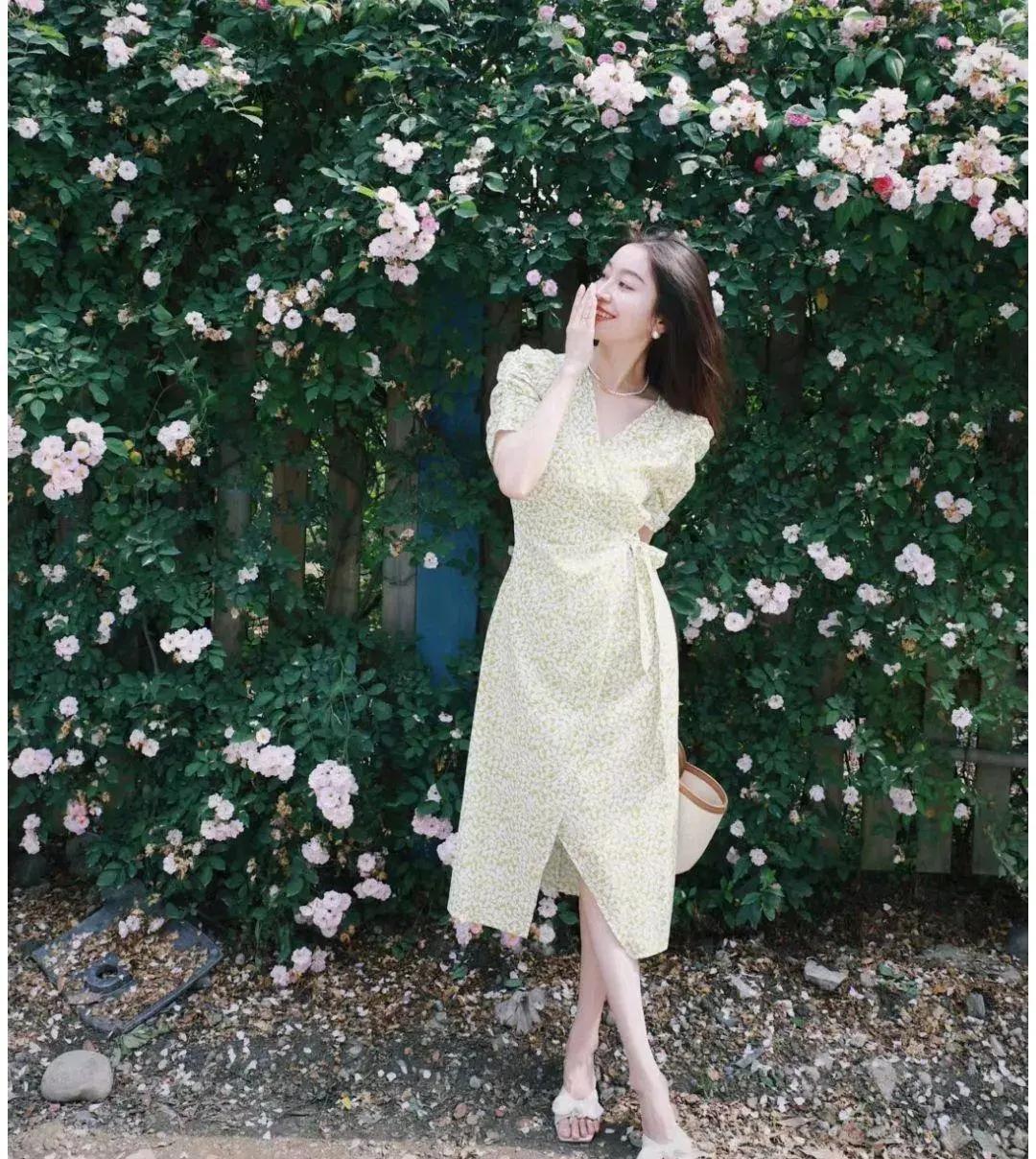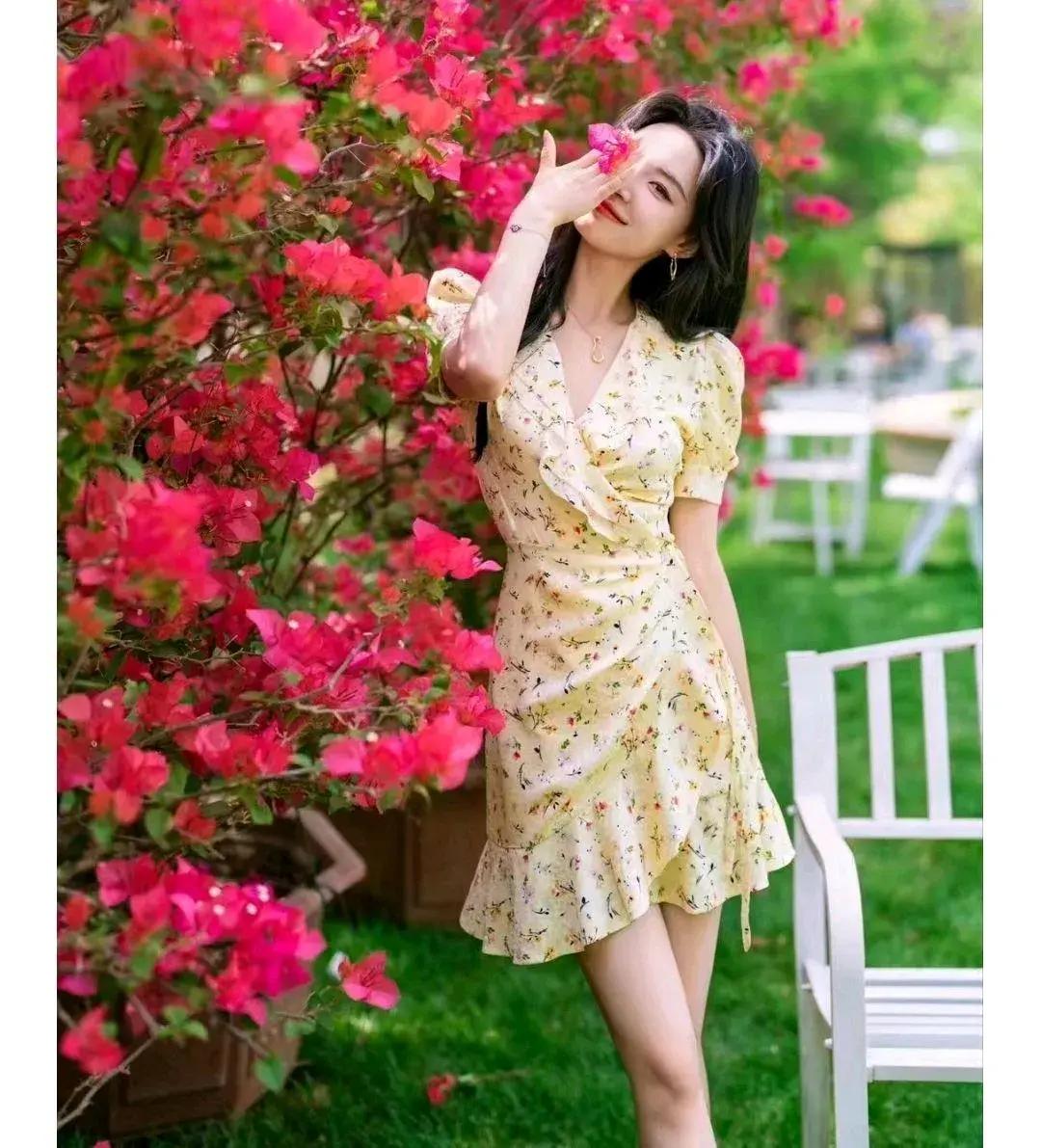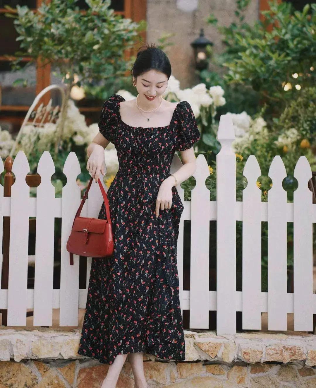 誰懂啊,真的很喜歡這麼一條法式的茶歇裙,上面的花卉圖案點綴着,想不浪漫都難。裙子的長度,剛好遮過小腿肚,加上高腰和深v領的設計,小個子也可以輕鬆顯高挑。