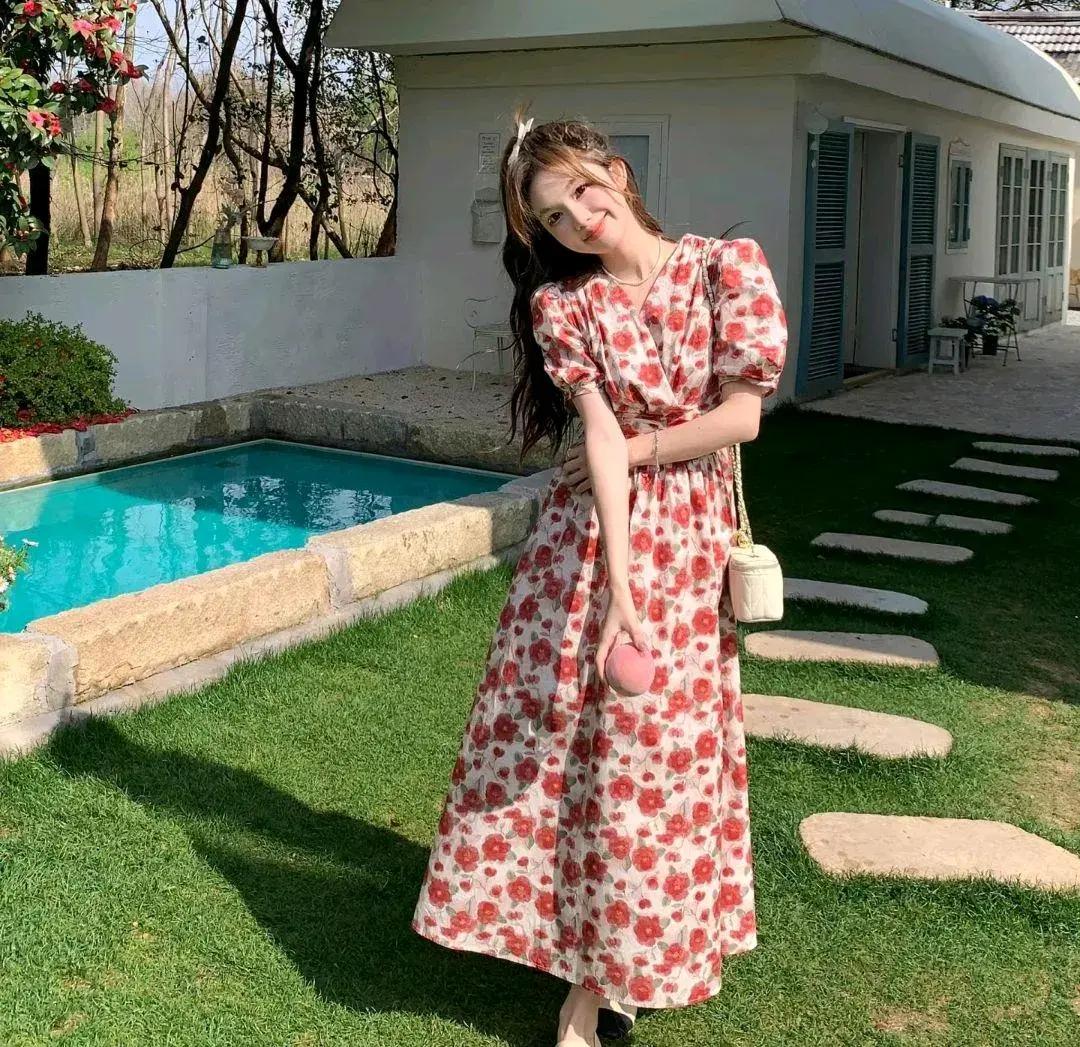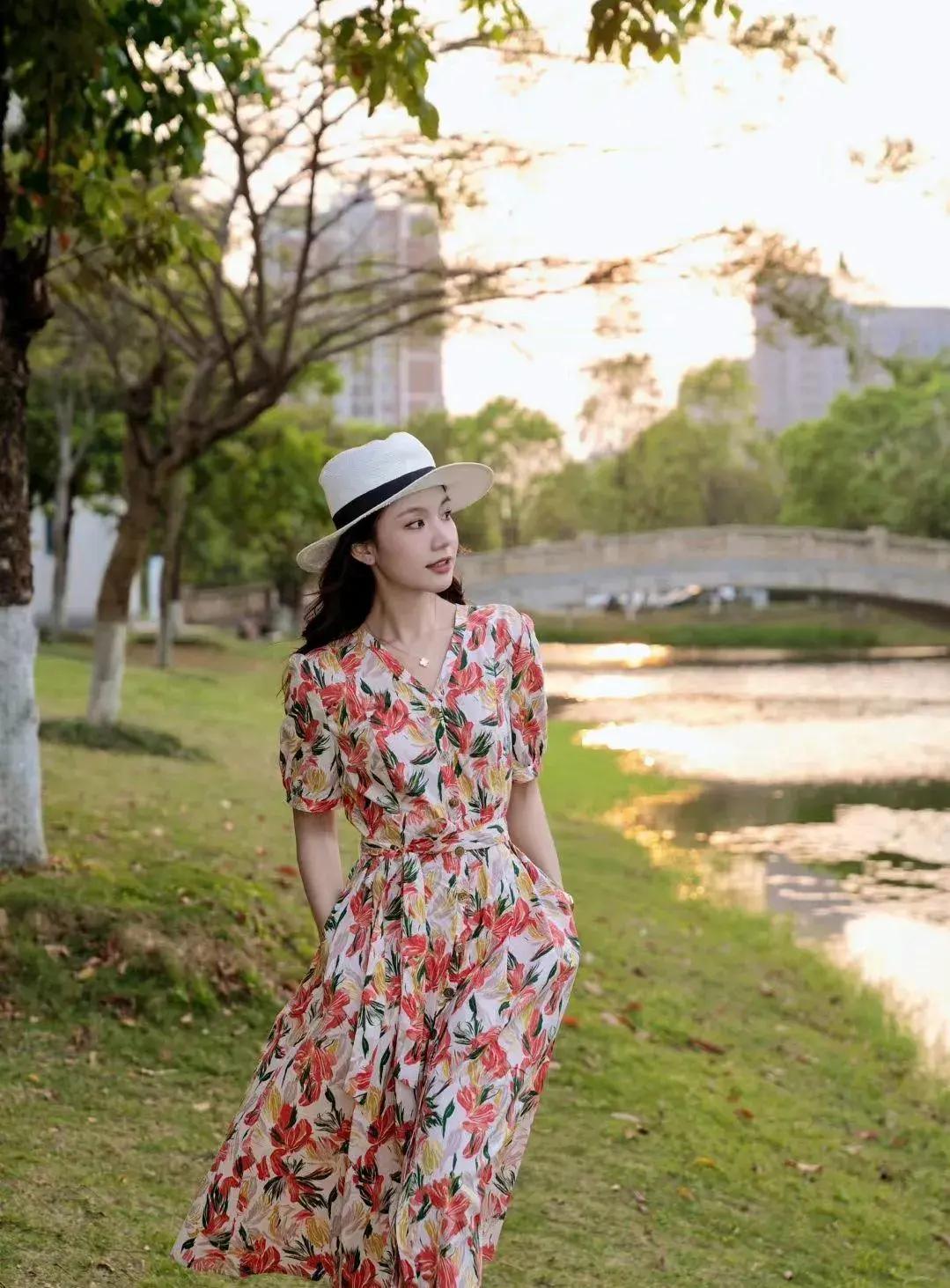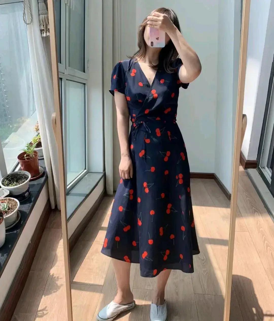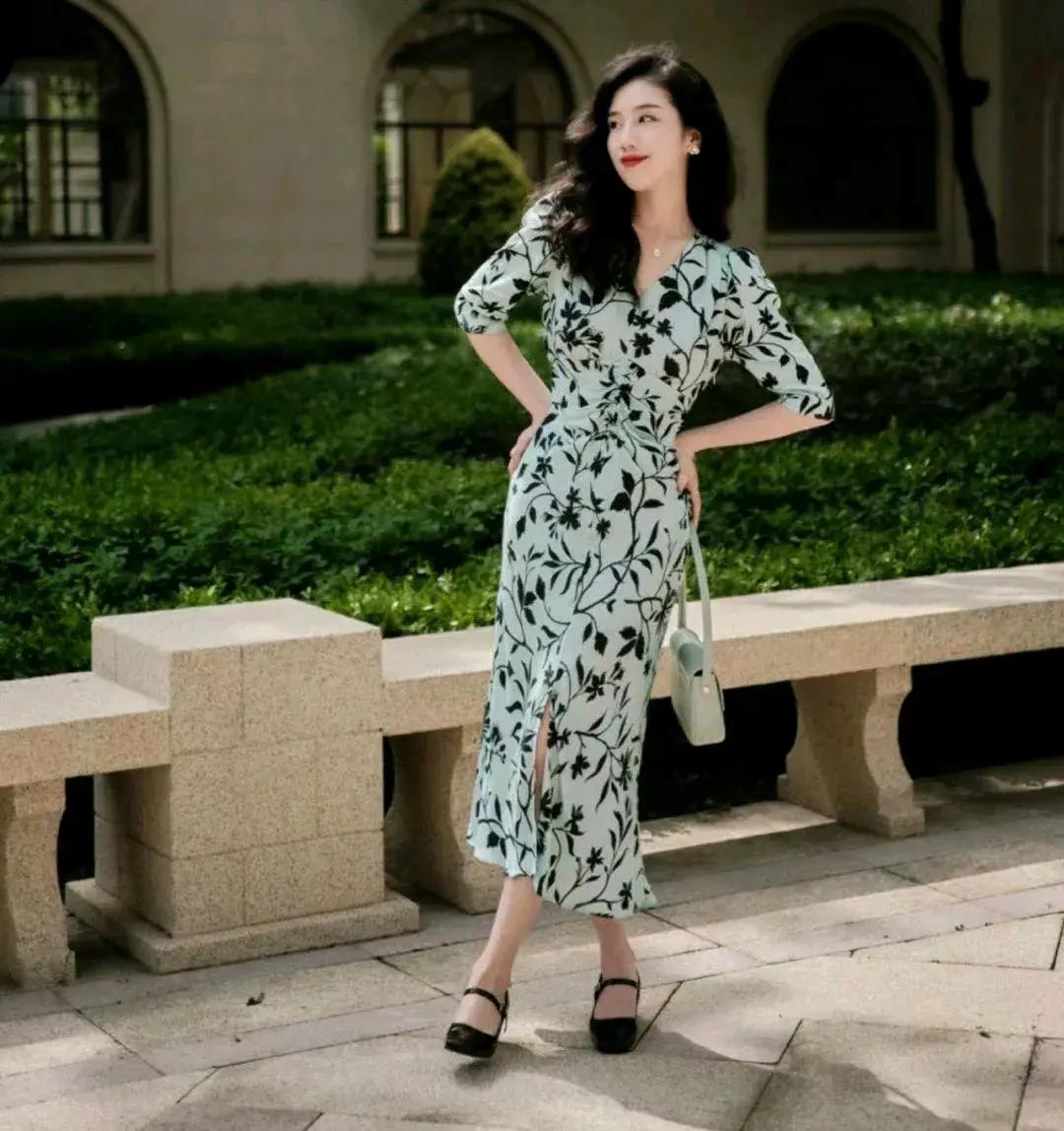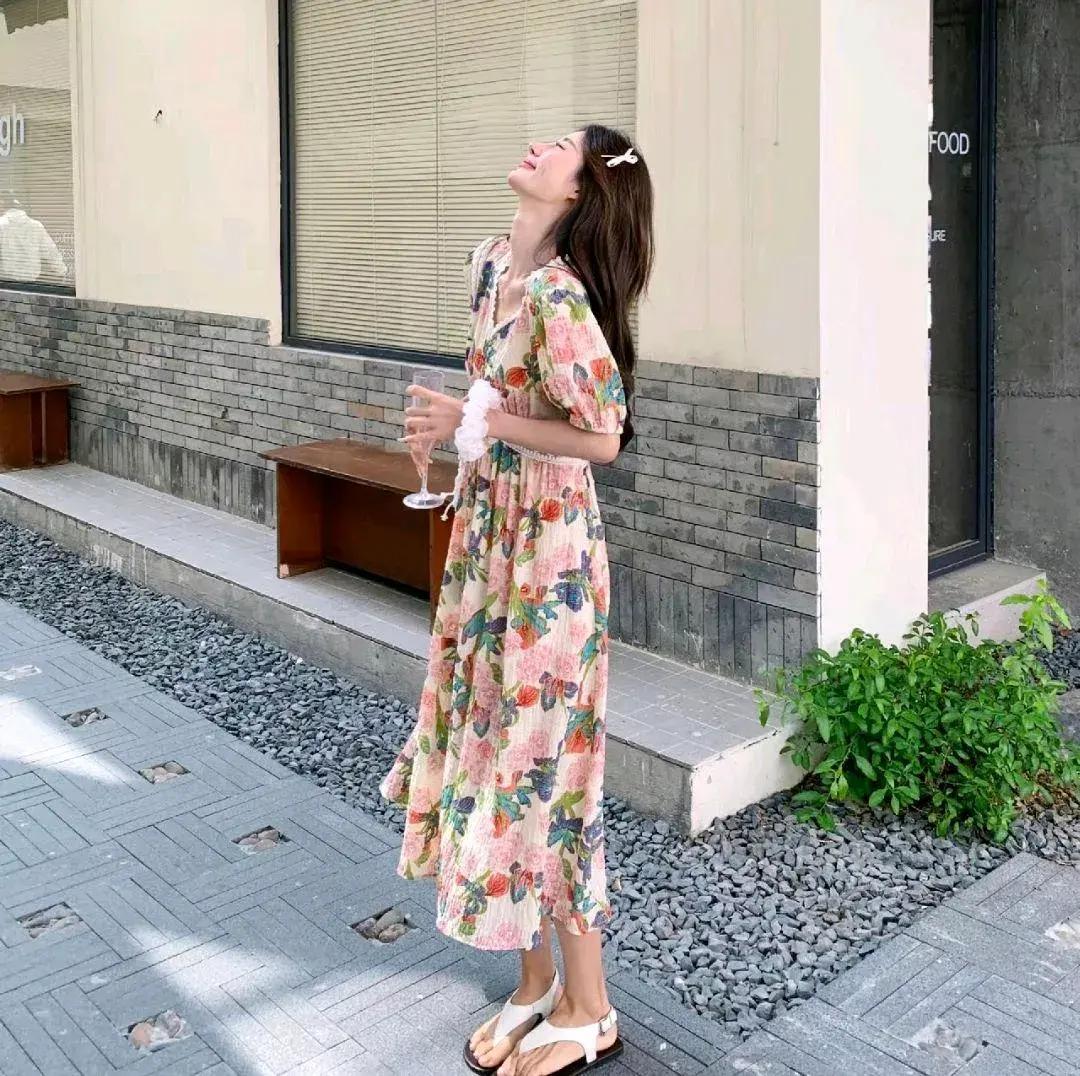 誰懂啊,真的很喜歡這麼一條法式的茶歇裙,上面的花卉圖案點綴着,想不浪漫都難。裙子的長度,剛好遮過小腿肚,加上高腰和深v領的設計,小個子也可以輕鬆顯高挑。
