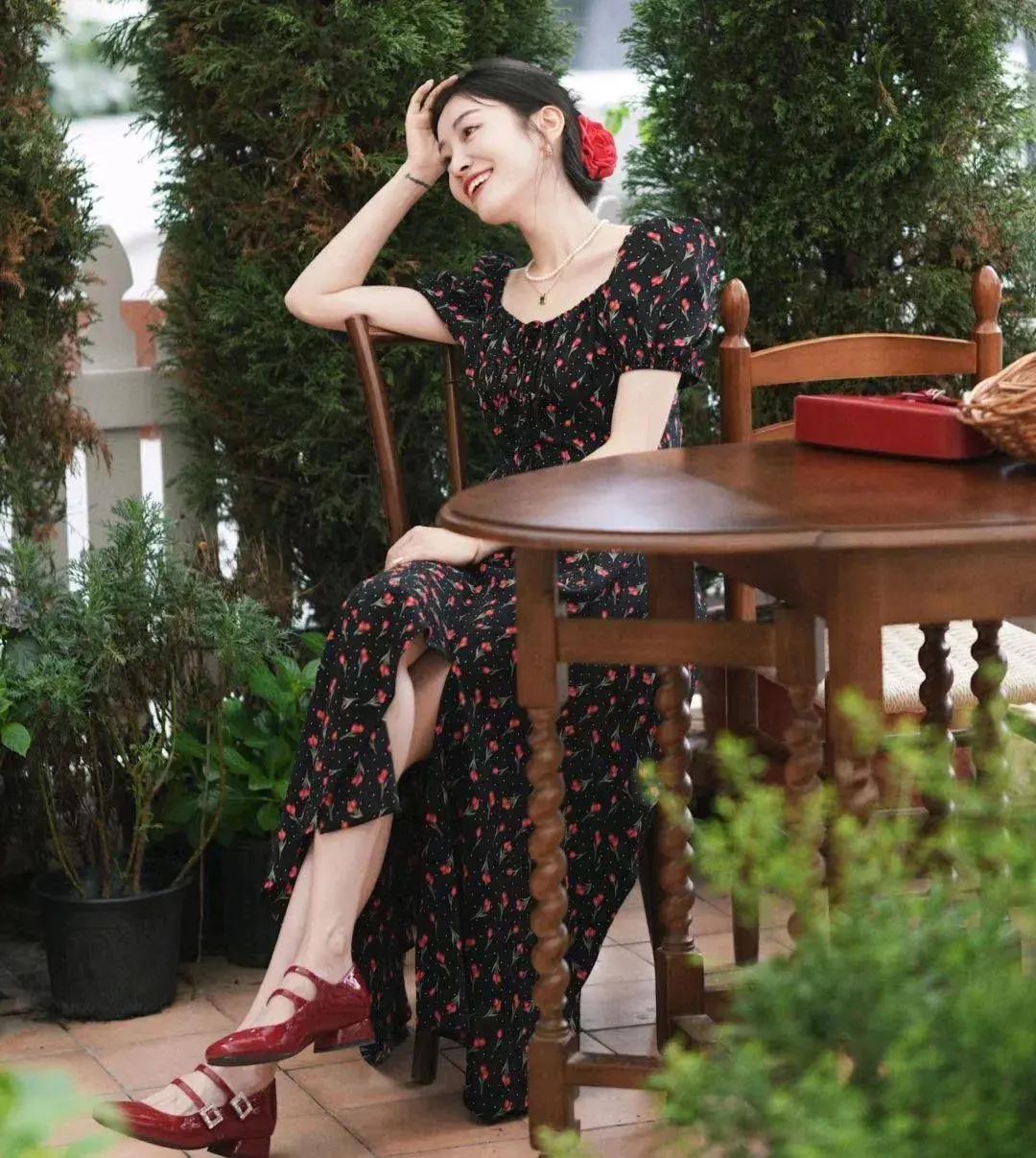 慵懶舒適和自在的法式氛圍感穿搭,簡直太好看了,方領的茶歇裙,和深v 領一樣,都能很好修飾你的脖子線條,從而在視覺上起到瘦臉的效果。腳上踩着一雙粗跟紅色瑪麗珍單鞋,太溫柔氣質了。