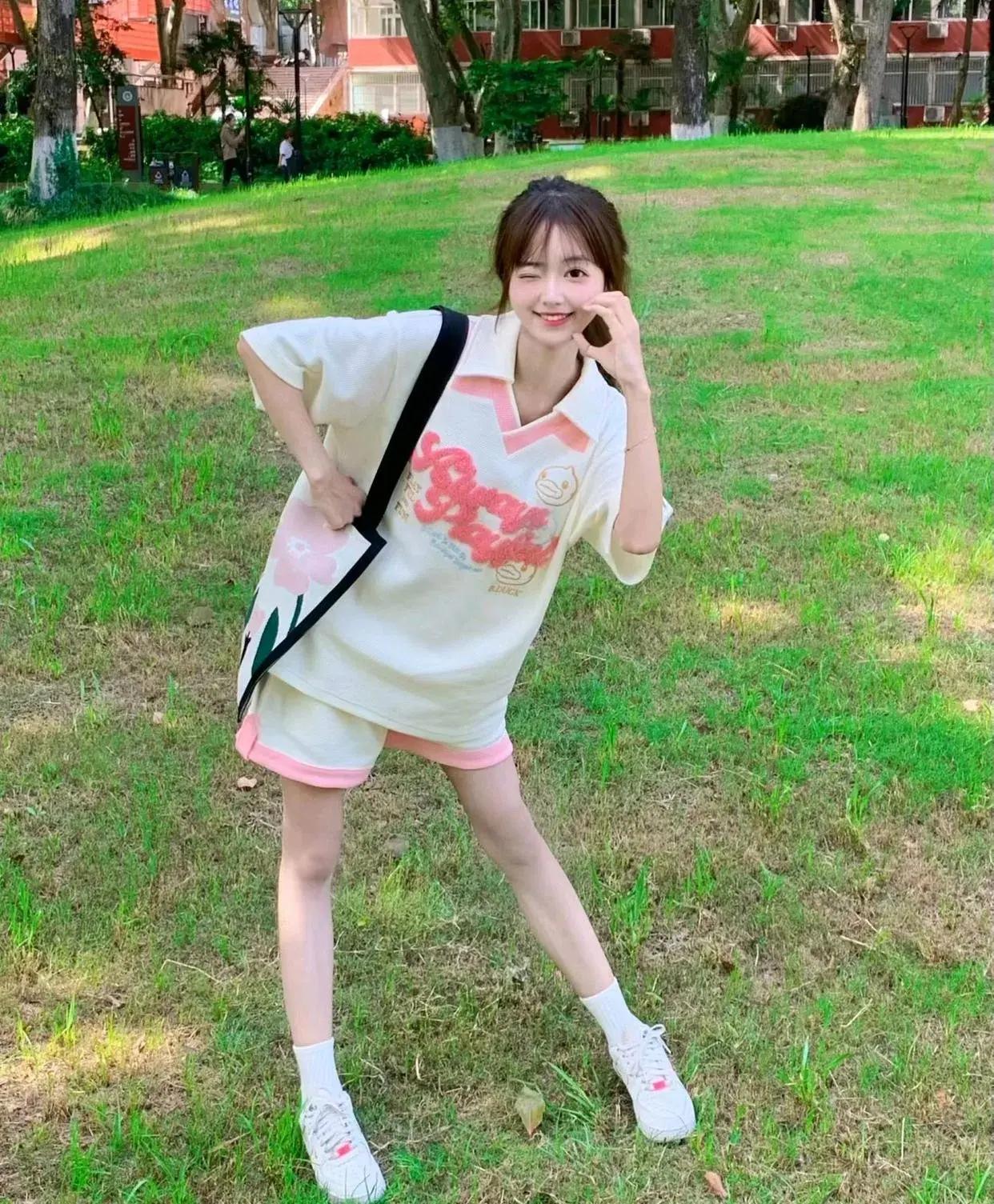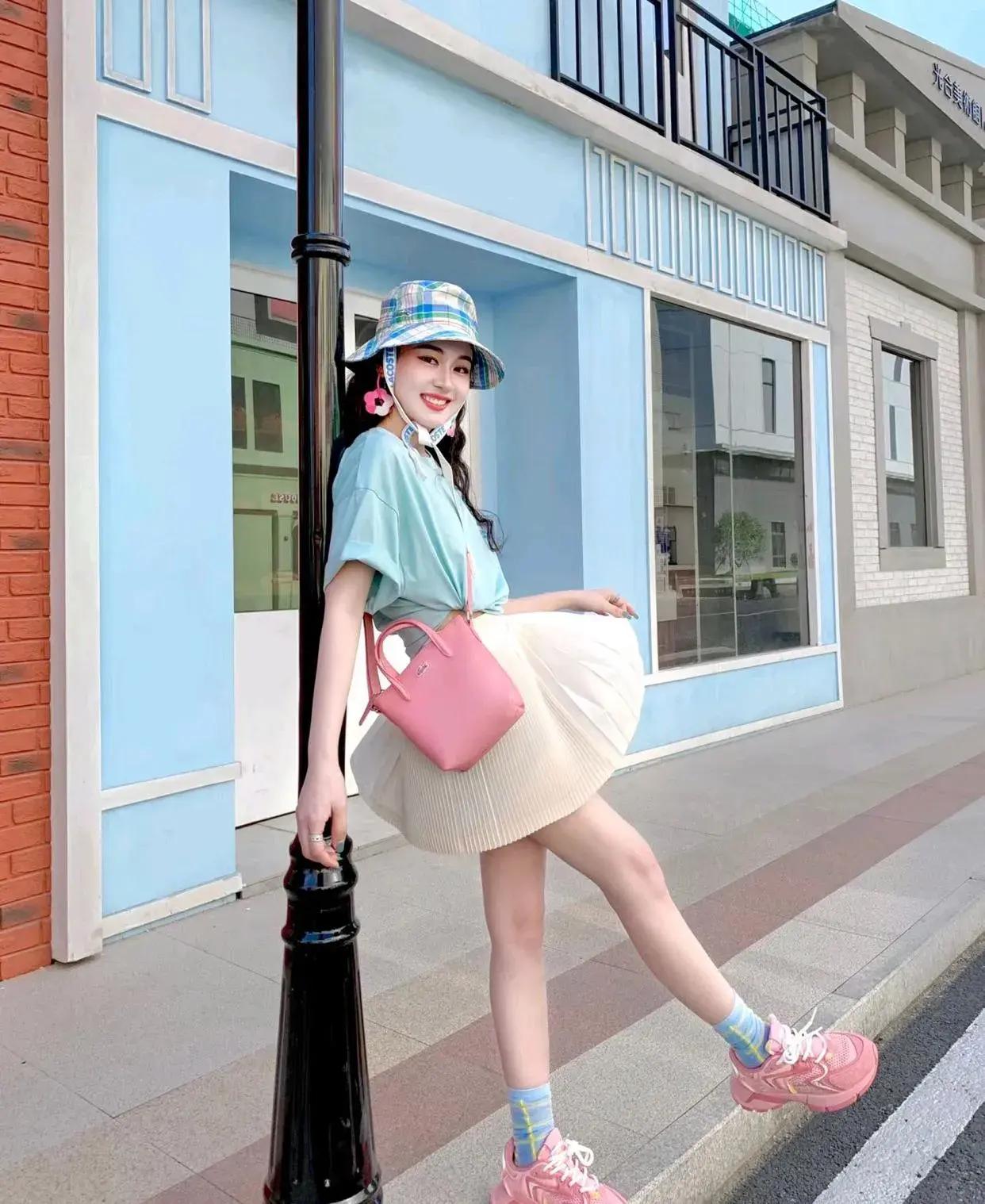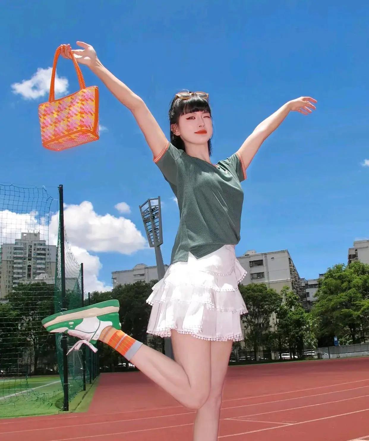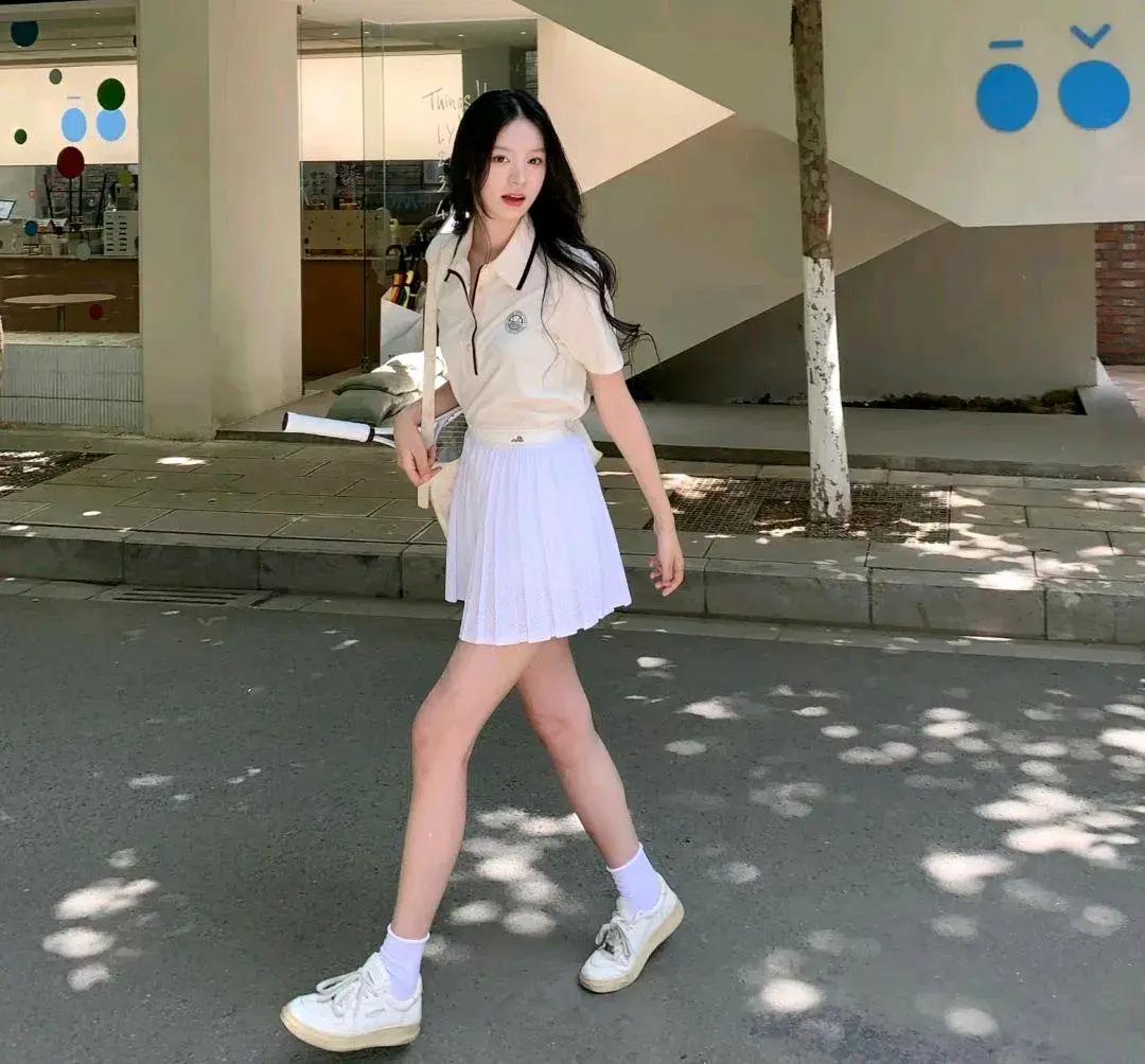 現在天氣這麼好,就約上自己好友一起去戶外運動吧,多曬曬太陽,多運動一下心情才更好。粉色短袖t 恤和白色百褶半裙,加上一雙黑色運動鞋,一整個青春感十足。