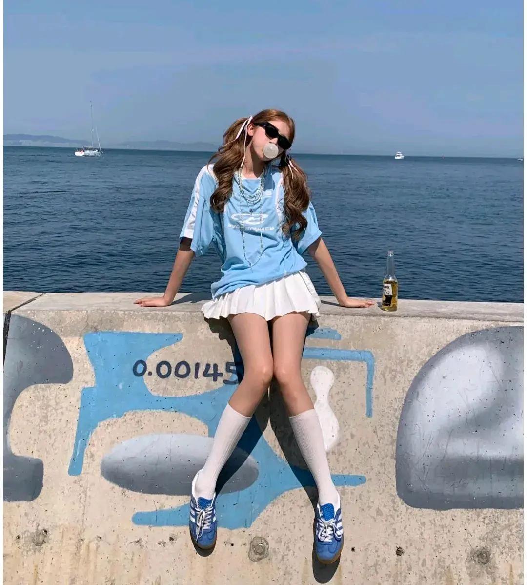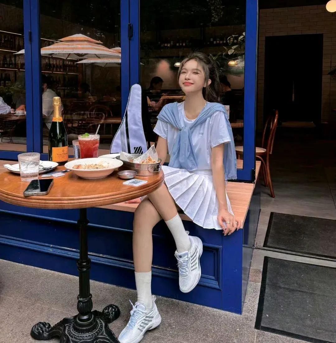 藍色球衣和白色百褶短裙的組合,運動風滿滿的,記得要利用起一雙襪子來增加造型層次感,腳下踩着一雙德訓鞋,休閒舒適又不失青春活力。