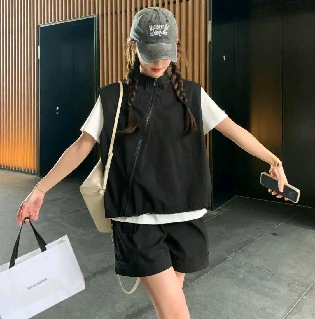 夏日甜酷風十足的穿搭,這一套看起來也太帥了,很讓人心動的運動三件套,黑色馬甲+白色t 恤+黑色短褲,這一套看起來就非常休閒和顯瘦。減齡效果超級不錯的。