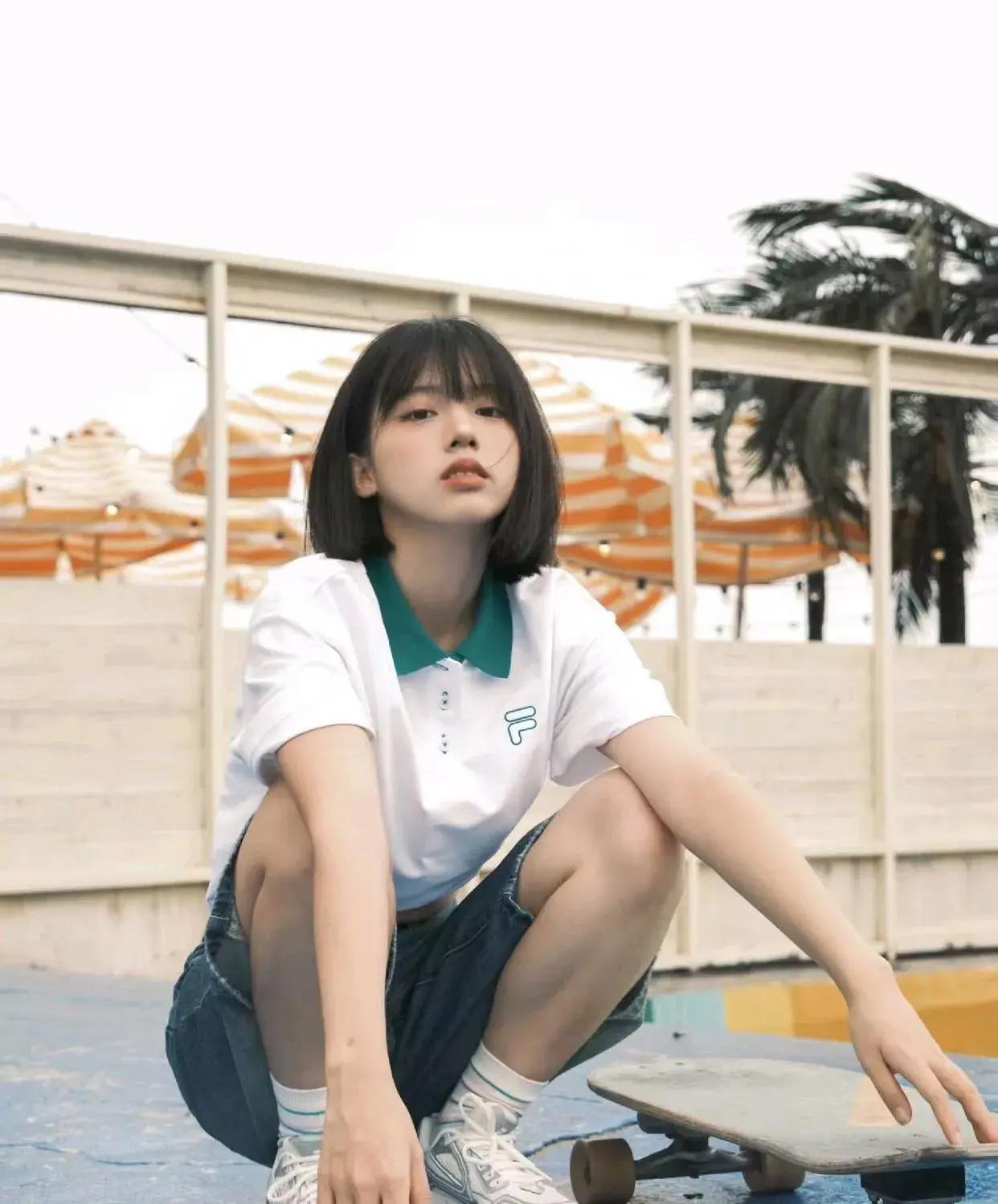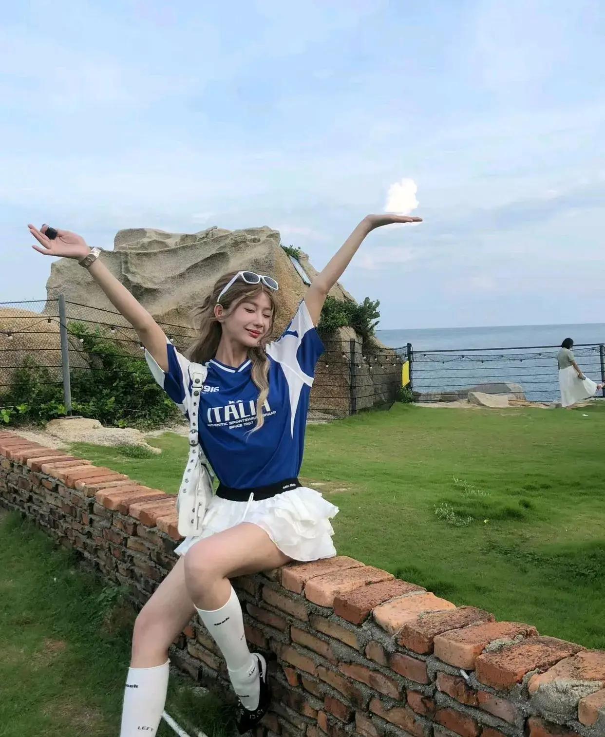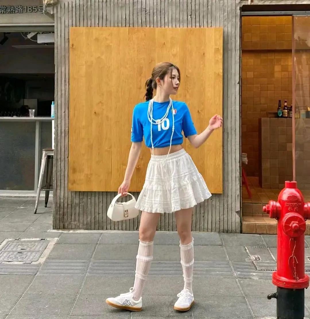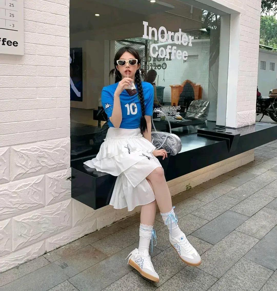 藍色球衣和白色半身裙的碰撞,再搭配一雙運動鞋,運動風與鬼馬少女風的混搭,復古又不失休閒。