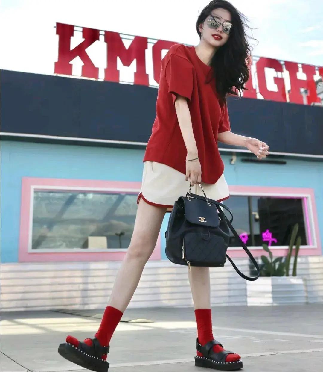 紅色t 恤+白色短褲,慵懶隨意範十足,腿部比例好的姐妹,就可以試試這樣穿。