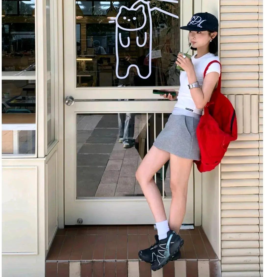 一緊一鬆的搭配,對於身材有着極佳的修飾效果,白色正肩短袖t 恤,今年很流行的款式。搭配灰色休閒運動半裙,再加上運動鞋和棒球帽,運動風十足。