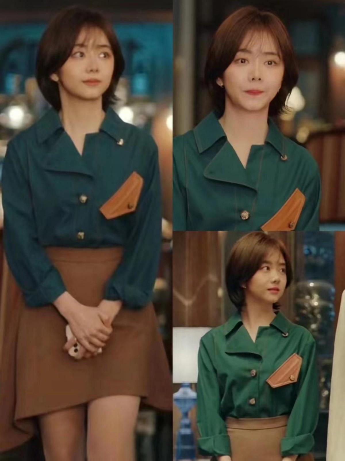 劇中譚松韻摒棄黑色、白色、灰色這些基礎色襯衫,選擇了不常見的墨綠色襯衫。也正是因爲色彩新穎又少見,譚松韻這身襯衫搭配半身裙造型才時髦又好看。