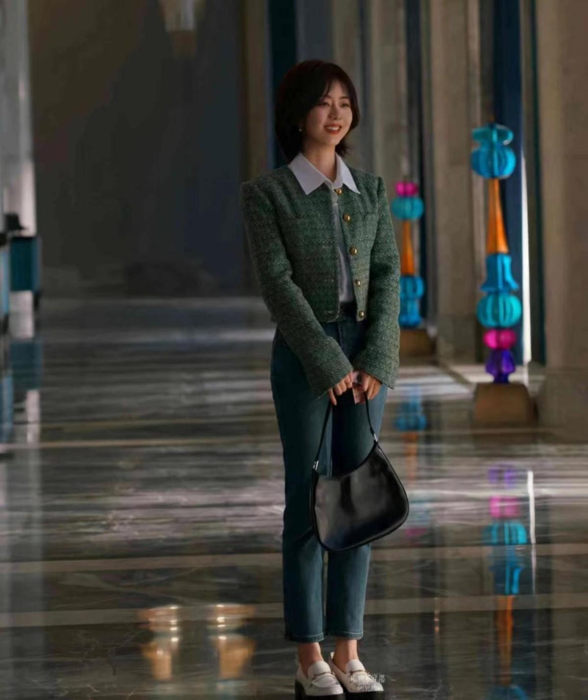 像劇中譚松韻這身“綠色小香風短款外套+高腰牛仔褲”造型,既可以明確腰線位置,打造三七分身材比例,又可以凸顯小蠻腰,秀出好身材。