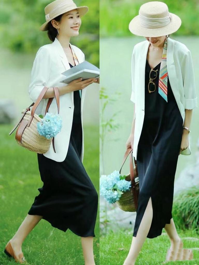 用醋酸吊帶裙配白色小西服外套,是簡潔清爽的美。