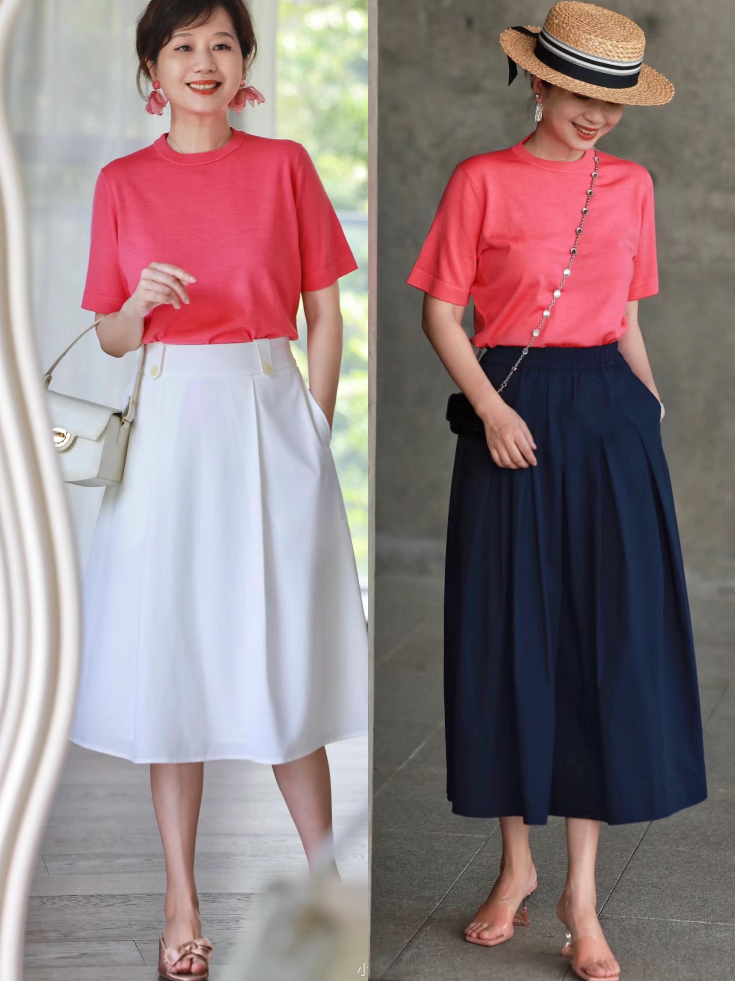 寬鬆的T恤,配高腰的傘裙,有一種鬆弛、自然,舒適大方的美。