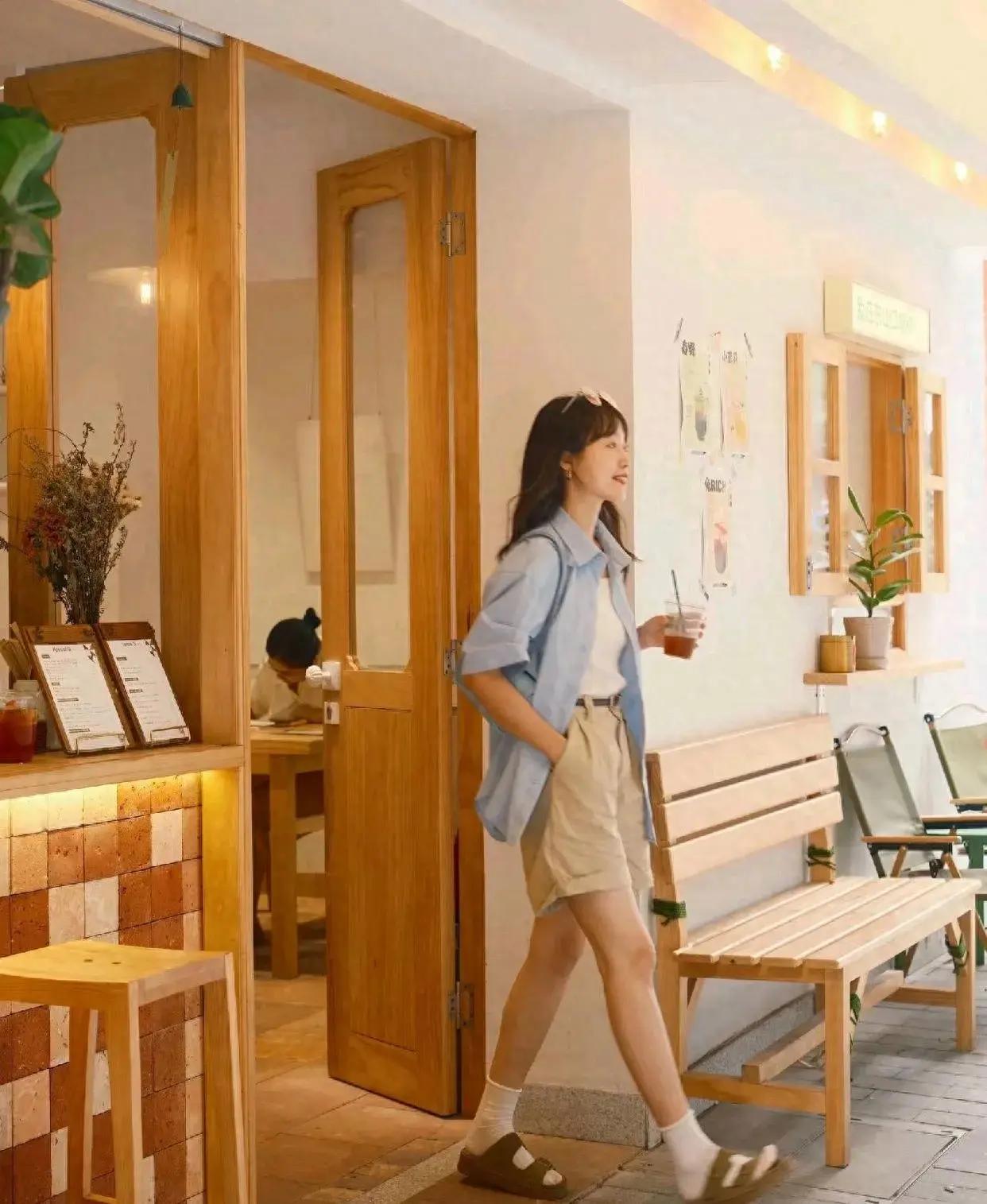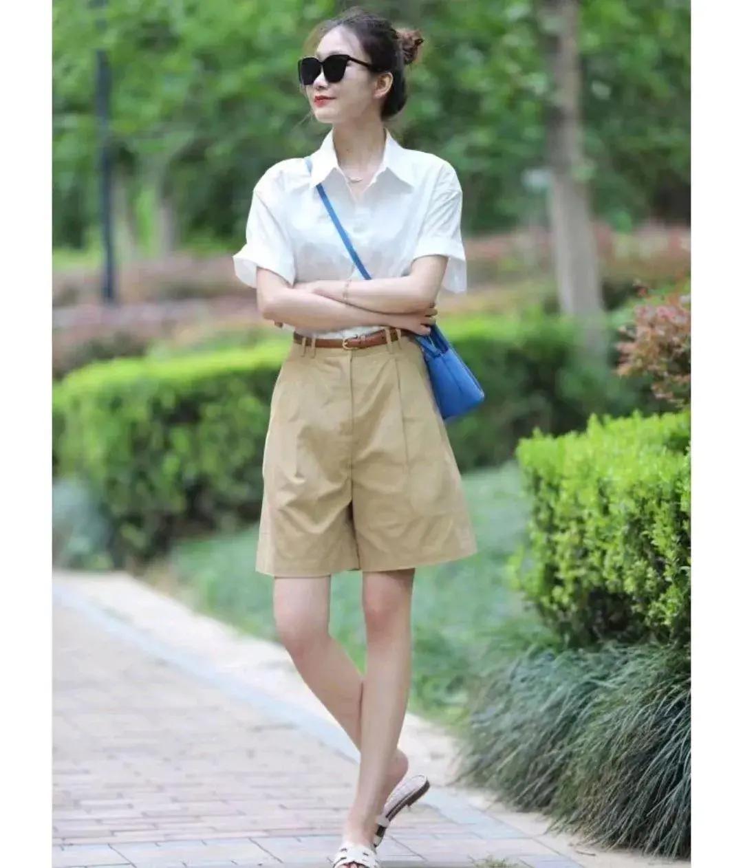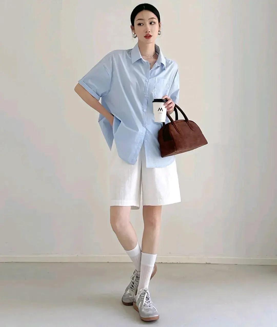 少年感十足的一件短袖襯衫,這種基礎款式,可是最能穿出高級感的了,也完全不挑人。海鹽藍的配色,可太襯膚色了,低飽和度的藍調,什麼膚色都可以駕馭。與白色休閒短褲相配,藍白組合,太清爽好看了。