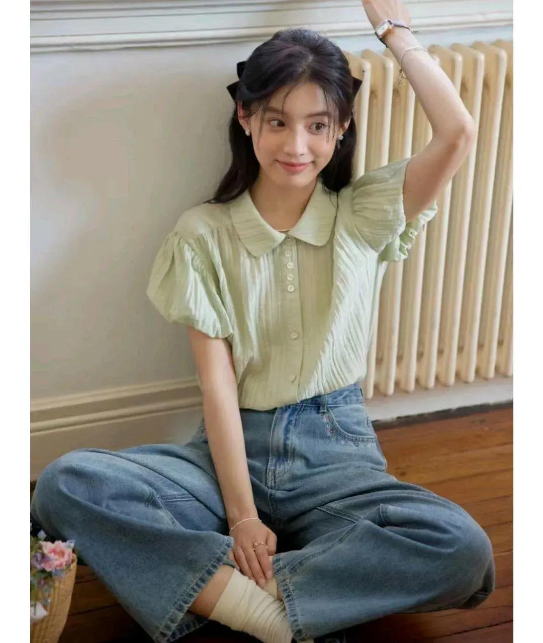 這一件襯衫穿起來也太乖了吧,花苞袖襯衫,也太甜美和減齡了。精緻小巧的娃娃領,寬鬆的版型襯托,讓你穿得舒適自在又顯瘦。搭配起一條直筒牛仔褲吧,這也太修飾腿部線條了,很顯腿直和腿長。