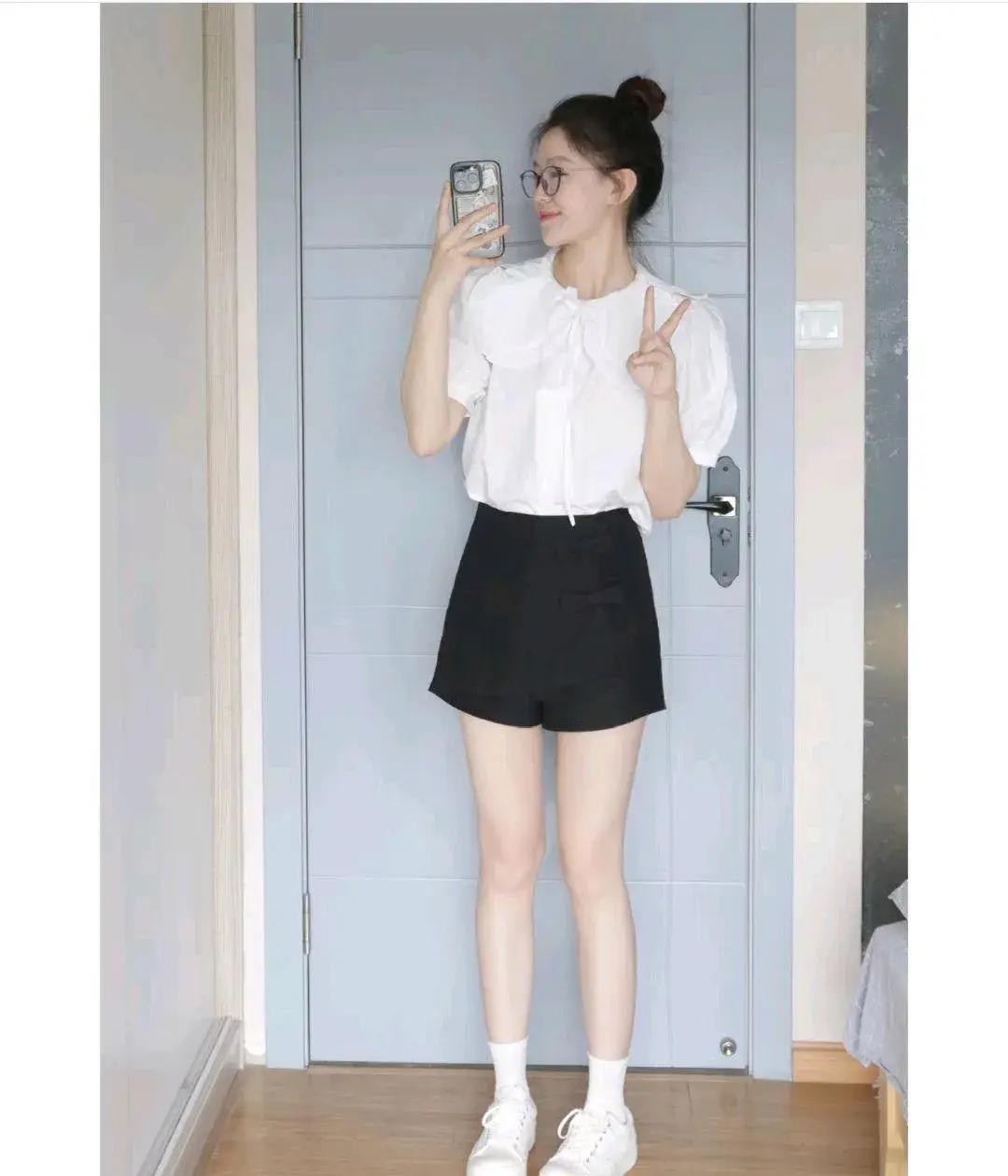 白色泡泡袖娃娃領襯衫,搭配黑色西裝短褲,記得要把襯衫塞進褲子裏面,從提高身材比例,一秒助你打造出大長腿!