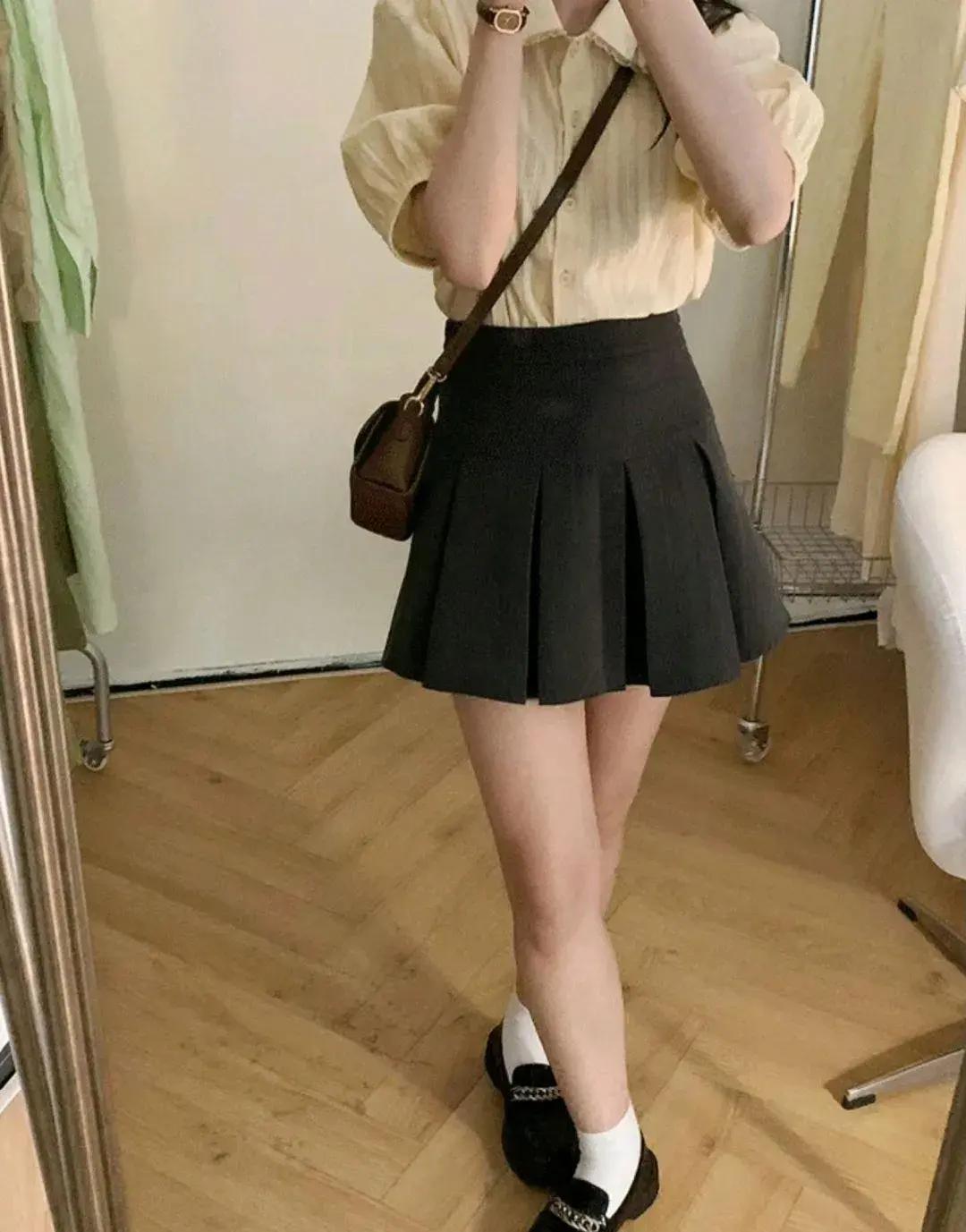 增加了娃娃領和泡泡袖的設計,讓你穿得更甜美減齡,一秒就打造出少女範。下身搭配的是一條百褶短裙,青春又充滿活力。