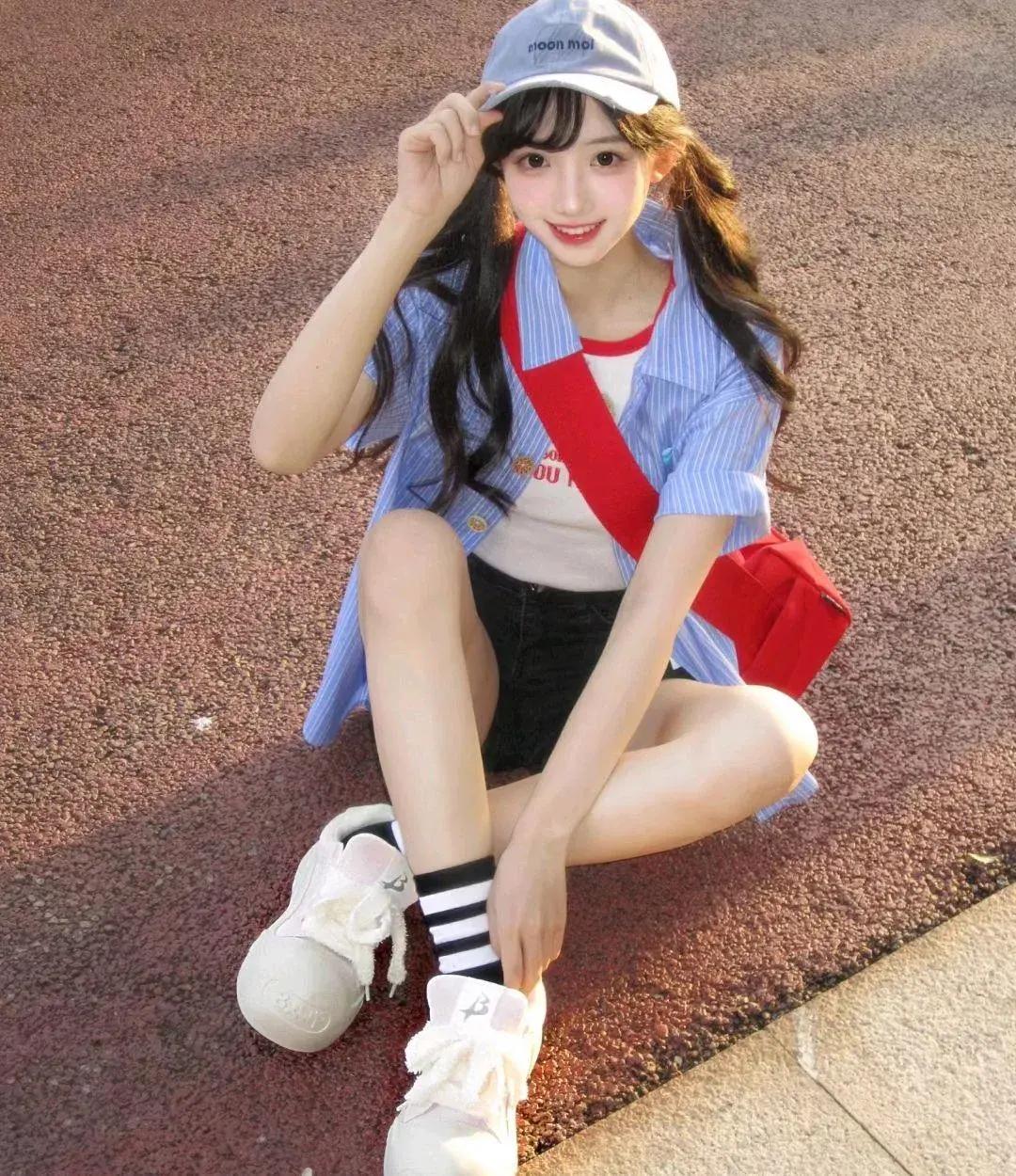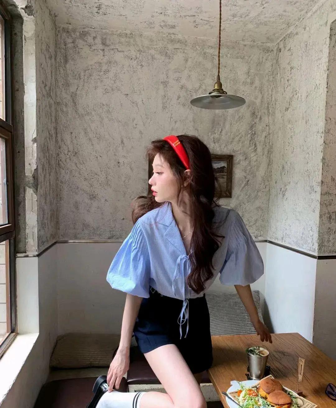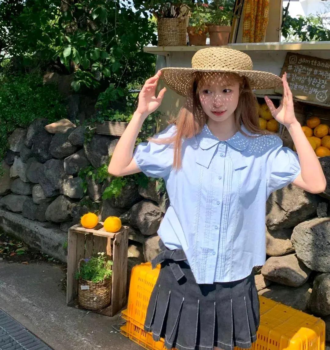 藍色娃娃領短袖襯衫+百褶裙,看起來真的是好乖啊,十分清新的藍色調,也太襯膚色了吧?