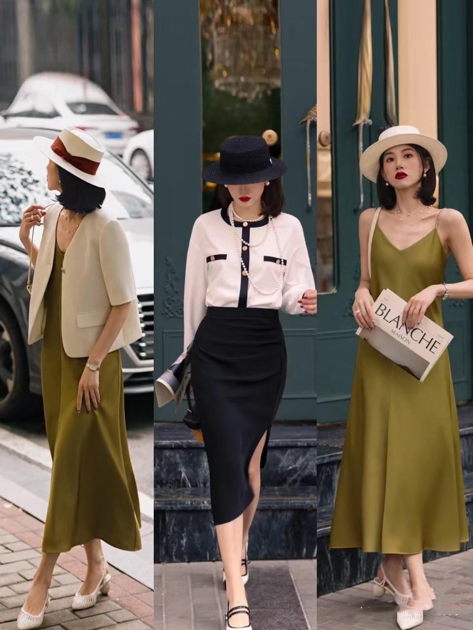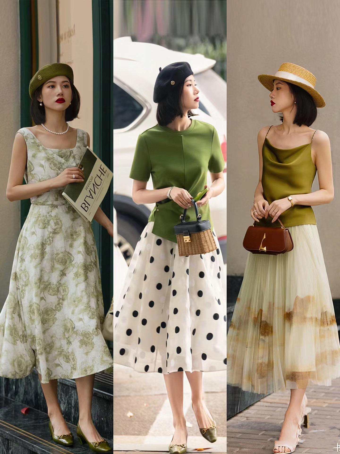 牛油果色的吊帶連衣裙,相對醒目又很顯白。